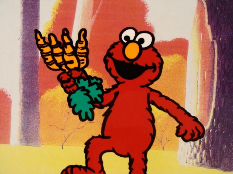 In Elmo's world everyone is happy and full of laughter. Elmo enjoys making friends and having a good time. In the cel, Elmo is excited to have healthy food * * * Original Animation Cel & Printed Background * * Medium: Hand painted acetate celDetails: Animation notations and peg holes * * Size of cel: 10 1/2 x 12 1/2 inchesSize of background: 11 x 15 inches * * Condition: Very good * * * This is an original hand-painted cel set-up used in the production of an episode of "Sesame Street." Each one-of-a-kind set-up represents a slight change in position of the characters. When individually photographed and projected in rapid succession, the * images appear to move. * * To create production cels, the original animator's drawing is transferred onto an acetate cel (by hand-inking and/or photo copying). The cel is then hand-painted on the reverse side. The background accompanying this set-up is a printed reproduction background. * *