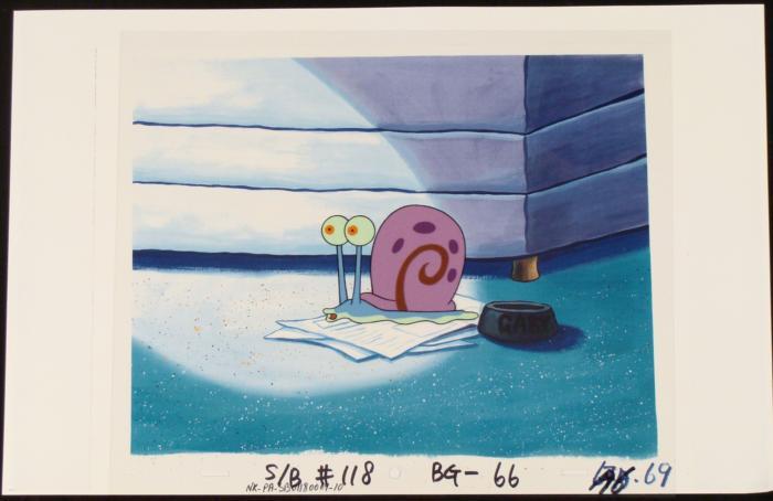This animation cel and reproduction background are from the Nickelodeon TV show SpongeBob Squarepants. The story takes place under the deep blue sea in Bikini Bottom, where SpongeBob resides. SpongeBob, who is a yellow, porous sponge, is your typical happy-go-lucky character, as he is always cheerful and enjoys making people laugh. Patrick Star, SpongeBob's neighbor who is a starfish, is your average children's show idiot, as he boasts knowing nothing and is often getting himself into ridiculous situations. Between the homes of these two lies the home of the miserable Squidward, a squid, who is known for being grouchy and playing tricks on SpongeBob and Patrick. Both SpongeBob and Squidward work at the Krusty Krab, a fast food business run by the greedy money-loving Mr. Krabs, a crab, the arch rival of the evil, possibly misunderstood, Plankton. Another neighbor, Sandy Cheeks, an athletic squirrel who normally wears an astronaut's space suit, was introduced in "Tea at the Treedome." She spends most of her time inventing and experimenting. SpongeBob is holding a jellyfish in his hand.Original Printed Background and Animated Cel Overall Size of Background: 11" x 17" Overall Size of the Cel: 10 1/2" x 12 1/2" Very good condition This is an original hand-painted cel set-up used in the production of an episode of "SpongeBob SquarePants." Each one-of-a-kind set-up represents a slight change in position of the characters. When individually photographed and projected in rapid succession, the images appear to move.