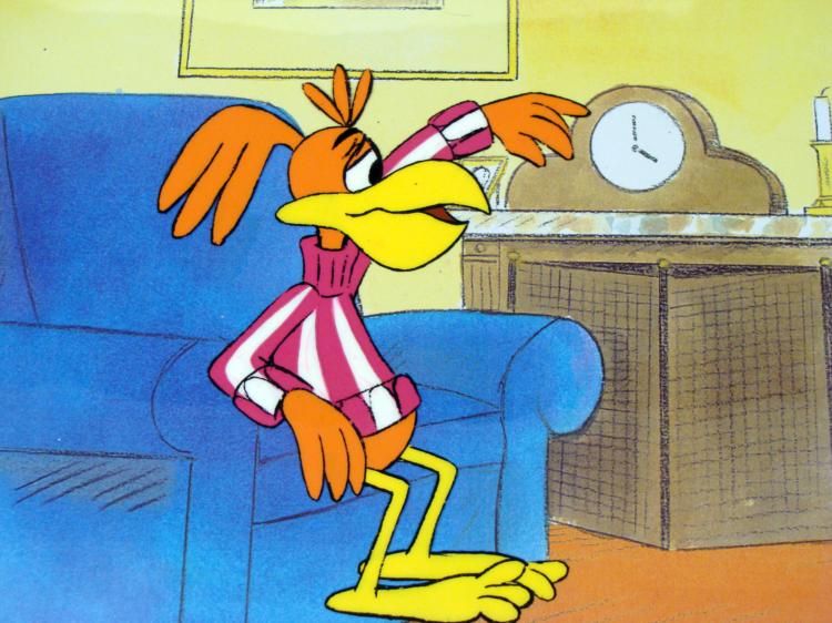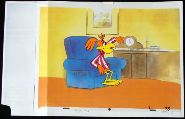 Man, they're running late again... They know how I get when I'm running late... * * * Original Animated Cel and Printed Background * * Overall Size of Background: 11" x 17" Overall Size of the Celz: 10 1/2" x 12 1/2" Very Good Condition * * * This is an original hand-painted cel set-up used in the production of a "Coco Puffs" TV Commercial. Each one-of-a-kind set-up represents a slight change in position of the characters. When individually photographed and projected in rapid succession, the * images appear to move. * * To create production cels, the original animator's drawing is transferred onto an acetate cel (by hand-inking and/or photo copying). The cel is then hand-painted on the reverse side. The background accompanying this set-up is a hand-painted original production * background. * * The background, drawing, and cel are ready to be matted and framed. The animators notations are located at the bottom of both. The left side of the background has been folded and the bottom left corner appears to have been ripped off. Also the bottom * left corner of the cel appears to have been cut off * * *