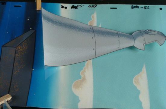 To create production cels, the original animator's drawing is transferred onto an acetate cel (by hand-inking and/or photo copying). The cel is then hand-painted on the reverse side. The background accompanying this set-up is a hand-painted original production background. The cel and background are ready to be matted and framed. The animator's notations are shown at the top of the cels and at the bottom of the background. The cel has multilayers; first the top of a rocketship and then the platform. The notations are taped to the bottom of the first cel. There are scratch marks at the top of the background. Close pins and paperclip were used to hold down the cels to minimize a reflection. The cel and background have been stored and rolled.