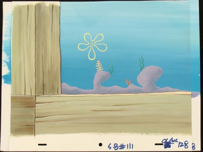 This original hand-painted background and paper cut-out cel are from the Nickelodeon TV show SpongeBob Squarepants. The story takes place under the deep blue sea in Bikini Bottom, where SpongeBob resides. SpongeBob, who is a yellow, porous sponge, is your typical happy-go-lucky character, as he is always cheerful and enjoys making people laugh. Patrick Star, SpongeBob's neighbor who is a starfish, is your average children's show idiot, as he boasts knowing nothing and is often getting himself into ridiculous situations. Between the homes of these two lies the home of the miserable Squidward, a squid, who is known for being grouchy and playing tricks on SpongeBob and Patrick. Both SpongeBob and Squidward work at the Krusty Krab, a fast food business run by the greedy money-loving Mr. Krabs, a crab, the arch rival of the evil, possibly misunderstood, Plankton. Another neighbor, Sandy Cheeks, an athletic squirrel who normally wears an astronaut's space suit, was introduced in "Tea at the Treedome." She spends most of her time inventing and experimenting. It appears to be looking out a window.Original Production Background Overall Size of Background: 10 1/2" x 13 3/4" Overall Size of Cel: 10 1/2" x 12 1/2" Very good conditionOriginal Production Backgrounds are used in the making of the final version of animated productions. The background establishes the location and the overall good mood of the scenee. Typically, a background layout artist creates a drawing to establish the content of the scene, placement of characters, perspective and camera angle. Based on this drawing, the background artist creates a preliminary painting to confirm all of the scenes details, then the final production background which is used in the filming of the scene. When these backgrounds are individually photographed behind the progression of production cels, and projected at a rapid succession, the images in the foreground appear to move, creating an animated scene. The background is ready to be matted and framed. It is a colored background with the animator's notations at the bottom. The background has multiple layers. The first layer is a cel with paper cut-outs on it. The second layer is the original background.