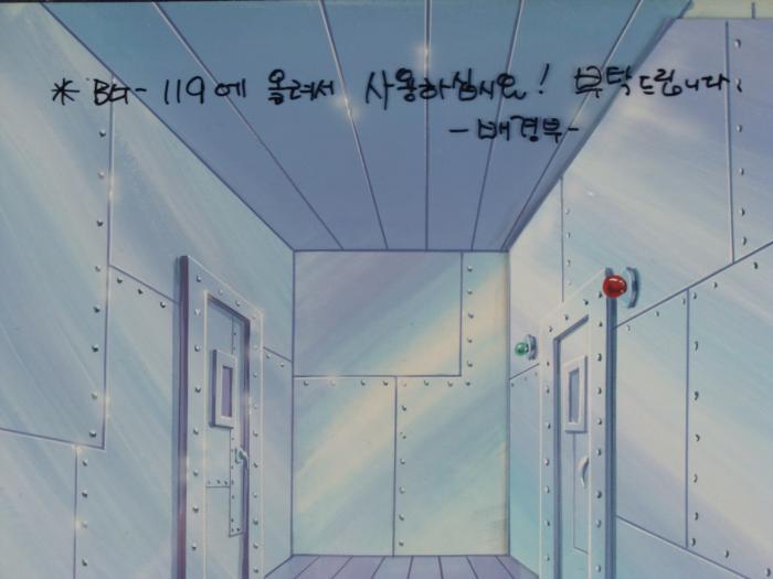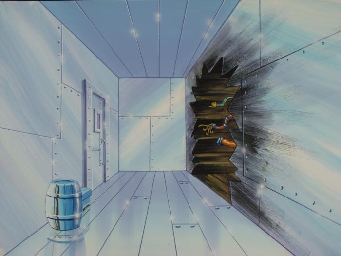 In this background, their a some sort of glow surrounding a door way in a restaurant. Someone or something blew a hole in the wall, but don't worry it's been patch up with another door. Original Production Background and Animated Cel Overall Size of Background: 10 1/2" x 14 1/2" Overall Size of the Cels: 10 1/2" x 12 1/2" Very good condition; it has been stored This is an original hand-painted cel set-up used in the production of an episode of "SpongeBob SquarePants." Each one-of-a-kind set-up represents a slight change in position of the characters. When individually photographed and projected in rapid succession, the images appear to move.