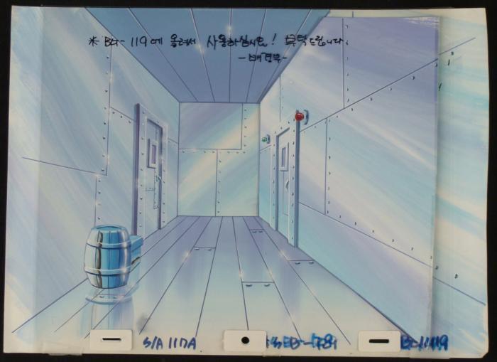 In this background, their a some sort of glow surrounding a door way in a restaurant. Someone or something blew a hole in the wall, but don't worry it's been patch up with another door. Original Production Background and Animated Cel Overall Size of Background: 10 1/2" x 14 1/2" Overall Size of the Cels: 10 1/2" x 12 1/2" Very good condition; it has been stored This is an original hand-painted cel set-up used in the production of an episode of "SpongeBob SquarePants." Each one-of-a-kind set-up represents a slight change in position of the characters. When individually photographed and projected in rapid succession, the images appear to move.