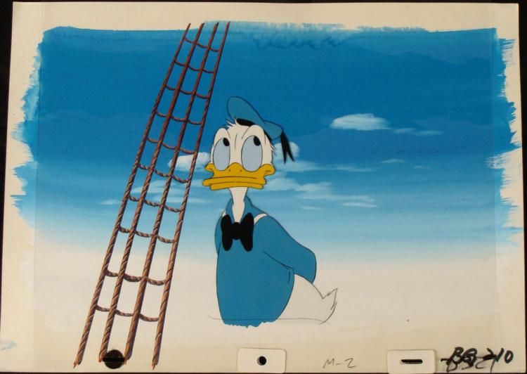 Donald Duck is a cartoon character created in 1934 at Walt Disney Productions. Donald is an anthropomorphic white duck with a yellow-orange bill, legs, and feet. He typically wears a sailor suit with a cap and a black or red bow tie. Donald is most famous * for his semi-intelligible speech and his mischievous and irritable personality. Along with his friend Mickey Mouse, Donald is one of the most popular Disney characters and was included in TV Guide's list of the 50 greatest cartoon characters of all time in * 2002 * * * * FOOLS!!! They have no idea that I don't have a clue on where we are going... * * * * The background that accompanies this cel doesn't correspond to the episode the cel is from. * * * Original Production Background and Animated Cel * Overall Size of Background: 10 1/4" x 14"Overall Size of the Cel: 10 1/2" x 12 1/2" * Excellent Condition * * * This is an original hand-painted cel set-up used in the production of an episode of "Donald Duck." Each one-of-a-kind set-up represents a slight change in position of the characters. When individually photographed and projected in rapid succession, the images * appear to move. * * To create production cels, the original animator's drawing is transferred onto an acetate cel (by hand-inking and/or photo copying). The cel is then hand-painted on the reverse side. The background accompanying this set-up is a hand-painted original production * background. * * The background and cel are ready to be matted and framed. It is a colored background with a cel that has the animator's notations at the bottom of both. * * * *