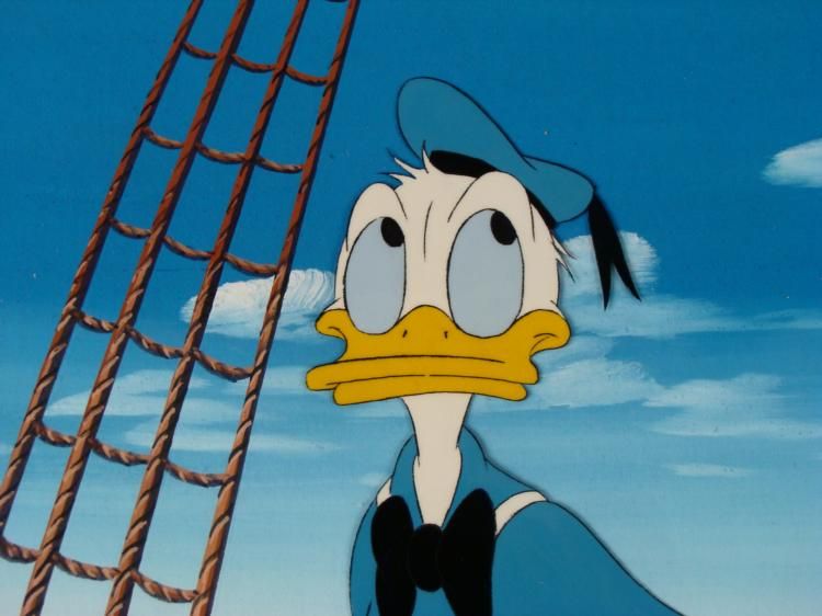 Donald Duck is a cartoon character created in 1934 at Walt Disney Productions. Donald is an anthropomorphic white duck with a yellow-orange bill, legs, and feet. He typically wears a sailor suit with a cap and a black or red bow tie. Donald is most famous * for his semi-intelligible speech and his mischievous and irritable personality. Along with his friend Mickey Mouse, Donald is one of the most popular Disney characters and was included in TV Guide's list of the 50 greatest cartoon characters of all time in * 2002 * * * * FOOLS!!! They have no idea that I don't have a clue on where we are going... * * * * The background that accompanies this cel doesn't correspond to the episode the cel is from. * * * Original Production Background and Animated Cel * Overall Size of Background: 10 1/4" x 14"Overall Size of the Cel: 10 1/2" x 12 1/2" * Excellent Condition * * * This is an original hand-painted cel set-up used in the production of an episode of "Donald Duck." Each one-of-a-kind set-up represents a slight change in position of the characters. When individually photographed and projected in rapid succession, the images * appear to move. * * To create production cels, the original animator's drawing is transferred onto an acetate cel (by hand-inking and/or photo copying). The cel is then hand-painted on the reverse side. The background accompanying this set-up is a hand-painted original production * background. * * The background and cel are ready to be matted and framed. It is a colored background with a cel that has the animator's notations at the bottom of both. * * * *