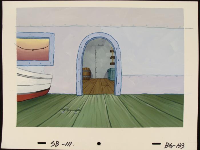 This original hand-painted background from the Nickelodeon TV show SpongeBob Squarepants. The story takes place under the deep blue sea in Bikini Bottom, where SpongeBob resides. SpongeBob, who is a yellow, porous sponge, is your typical happy-go-lucky character, as he is always cheerful and enjoys making people laugh. Patrick Star, SpongeBob's neighbor who is a starfish, is your average children's show idiot, as he boasts knowing nothing and is often getting himself into ridiculous situations. Between the homes of these two lies the home of the miserable Squidward, a squid, who is known for being grouchy and playing tricks on SpongeBob and Patrick. Both SpongeBob and Squidward work at the Krusty Krab, a fast food business run by the greedy money-loving Mr. Krabs, a crab, the arch rival of the evil, possibly misunderstood, Plankton. Another neighbor, Sandy Cheeks, an athletic squirrel who normally wears an astronaut's space suit, was introduced in "Tea at the Treedome." She spends most of her time inventing and experimenting. This is the door leading to where SpongeBob works.Original Production Background Overall Size of Background: 10 1/2" x 13 3/4" Very good conditionOriginal Production Backgrounds are used in the making of the final version of animated productions. The background establishes the location and the overall good mood of the scenee. Typically, a background layout artist creates a drawing to establish the content of the scene, placement of characters, perspective and camera angle. Based on this drawing, the background artist creates a preliminary painting to confirm all of the scenes details, then the final production background which is used in the filming of the scene. When these backgrounds are individually photographed behind the progression of production cels, and projected at a rapid succession, the images in the foreground appear to move, creating an animated scene. The background is ready to be matted and framed. It is a colored background with the animator's notations at the bottom.