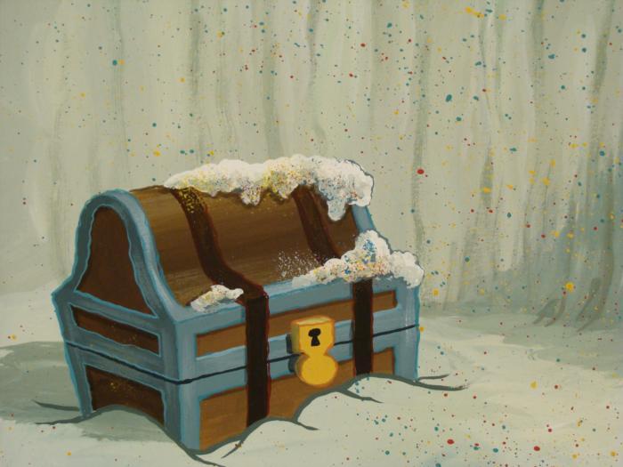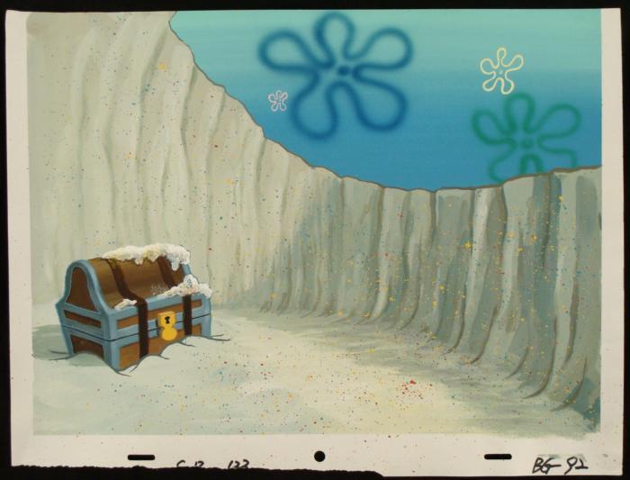 This original hand-painted background from the Nickelodeon TV show SpongeBob Squarepants. The story takes place under the deep blue sea in Bikini Bottom, where SpongeBob resides. SpongeBob, who is a yellow, porous sponge, is your typical happy-go-lucky character, as he is always cheerful and enjoys making people laugh. Patrick Star, SpongeBob's neighbor who is a starfish, is your average children's show idiot, as he boasts knowing nothing and is often getting himself into ridiculous situations. Between the homes of these two lies the home of the miserable Squidward, a squid, who is known for being grouchy and playing tricks on SpongeBob and Patrick. Both SpongeBob and Squidward work at the Krusty Krab, a fast food business run by the greedy money-loving Mr. Krabs, a crab, the arch rival of the evil, possibly misunderstood, Plankton. Another neighbor, Sandy Cheeks, an athletic squirrel who normally wears an astronaut's space suit, was introduced in "Tea at the Treedome." She spends most of her time inventing and experimenting. They found the treasure.Original Production Background Overall Size of Background: 10 1/2" x 13 3/4" Very good conditionOriginal Production Backgrounds are used in the making of the final version of animated productions. The background establishes the location and the overall good mood of the scenee. Typically, a background layout artist creates a drawing to establish the content of the scene, placement of characters, perspective and camera angle. Based on this drawing, the background artist creates a preliminary painting to confirm all of the scenes details, then the final production background which is used in the filming of the scene. When these backgrounds are individually photographed behind the progression of production cels, and projected at a rapid succession, the images in the foreground appear to move, creating an animated scene. The background is ready to be matted and framed. It is a colored background with the animator's notations at the bottom. Some of the bottom of the background has been ripped off. Some of the notations to the background have been ripped off.
