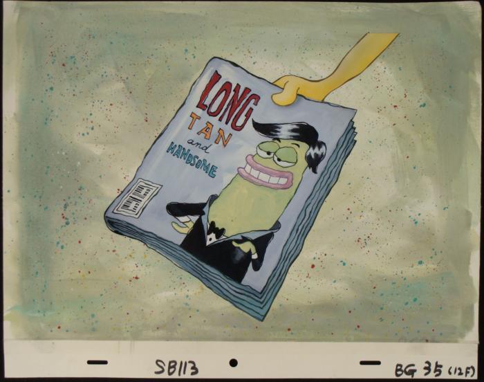 This original hand-painted background from the Nickelodeon TV show SpongeBob Squarepants. The story takes place under the deep blue sea in Bikini Bottom, where SpongeBob resides. SpongeBob, who is a yellow, porous sponge, is your typical happy-go-lucky character, as he is always cheerful and enjoys making people laugh. Patrick Star, SpongeBob's neighbor who is a starfish, is your average children's show idiot, as he boasts knowing nothing and is often getting himself into ridiculous situations. Between the homes of these two lies the home of the miserable Squidward, a squid, who is known for being grouchy and playing tricks on SpongeBob and Patrick. Both SpongeBob and Squidward work at the Krusty Krab, a fast food business run by the greedy money-loving Mr. Krabs, a crab, the arch rival of the evil, possibly misunderstood, Plankton. Another neighbor, Sandy Cheeks, an athletic squirrel who normally wears an astronaut's space suit, was introduced in "Tea at the Treedome." She spends most of her time inventing and experimenting. Shown here is someone holding an apparent magazine called Long Tan and Handsome.Original Production Background Overall Size of Background: 11" x 14" Very good condition; it has been stored Original Production Backgrounds are used in the making of the final version of animated productions. The background establishes the location and the overall good mood of the scenee. Typically, a background layout artist creates a drawing to establish the content of the scene, placement of characters, perspective and camera angle. Based on this drawing, the background artist creates a preliminary painting to confirm all of the scenes details, then the final production background which is used in the filming of the scene. When these backgrounds are individually photographed behind the progression of production cels, and projected at a rapid succession, the images in the foreground appear to move, creating an animated scene. The background is ready to be matted and framed. It is a colored background with the animator's notations taped at the bottom.