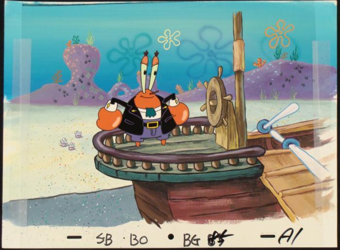 This original hand-painted background and animation cel is from the Nickelodeon TV show SpongeBob Squarepants. The story takes place under the deep blue sea in Bikini Bottom, where SpongeBob resides. SpongeBob, who is a yellow, porous sponge, is your typical happy-go-lucky character, as he is always cheerful and enjoys making people laugh. Patrick Star, SpongeBob's neighbor who is a starfish, is your average children's show idiot, as he boasts knowing nothing and is often getting himself into ridiculous situations. Between the homes of these two lies the home of the miserable Squidward, a squid, who is known for being grouchy and playing tricks on SpongeBob and Patrick. Both SpongeBob and Squidward work at the Krusty Krab, a fast food business run by the greedy money-loving Mr. Krabs, a crab, the arch rival of the evil, possibly misunderstood, Plankton. Another neighbor, Sandy Cheeks, an athletic squirrel who normally wears an astronaut's space suit, was introduced in "Tea at the Treedome." She spends most of her time inventing and experimenting. Who is captain of the ship?Original Production Background and Animated Cel Overall Size of Background: 11" x 14" Overall Size of the Cels: 10 1/2" x 12 1/2" Very good condition; it has been stored This is an original hand-painted cel set-up used in the production of an episode of "SpongeBob SquarePants." Each one-of-a-kind set-up represents a slight change in position of the characters. When individually photographed and projected in rapid succession, the images appear to move.