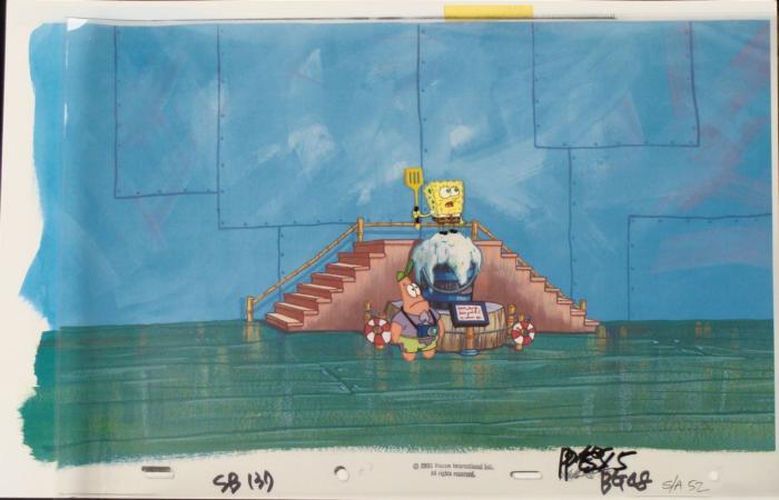 To create production cels, the original animator's drawing is transferred onto an acetate cel (by hand-inking and/or photo copying). The cel is then hand-painted on the reverse side. The background accompanying this set-up is a reproduction background. The printed background is ready to be matted and framed. The notations are located at the bottom of both. The cel is multi-layered: first is Spongebobe, next is Patrick's eyes, and then Patrick's body.