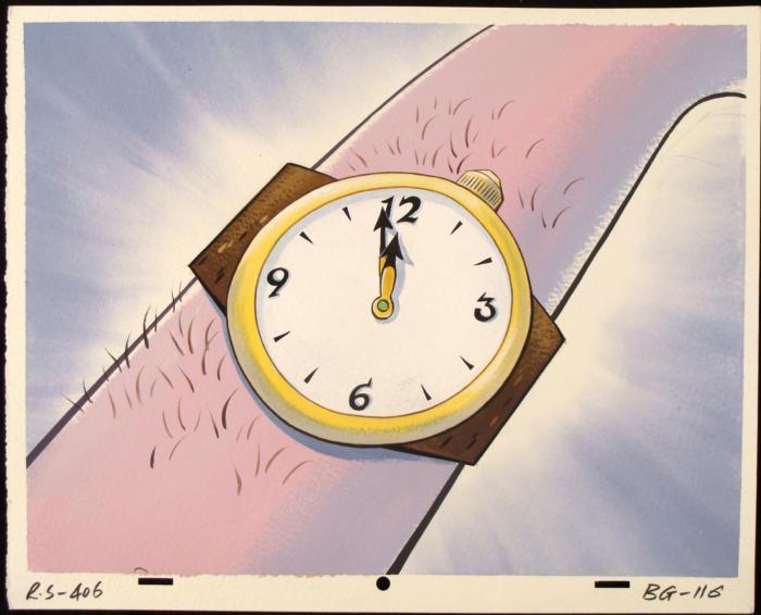 This original hand-painted background is from the Nickelodeon TV show Ren & Stimpy. The show follows two characters - Ren, a crazy Chihuahua - and - Stimpy, an incredibly stupid cat - as they think up to all kinds of hair brained schemes and get themselves into some sticky situations. The Ren and Stimpy Show debuted in August 1991 with a two-part episode, 'Stimpy's Big Day / The Big Shot' and became an instant hit. It was the third Nicktoon ever to be aired on the Network alongside Doug and Rugrats. What time is? What is it? IT'S PIG TIME, that's what time it is! Original Production Background Overall Size: 10 1/2" x 13" Excellent condition Original Production Backgrounds are used in the making of the final version of animated productions. The background establishes the location and the overall good mood of the scenee. Typically, a background layout artist creates a drawing to establish the content of the scene, placement of characters, perspective and camera angle. Based on this drawing, the background artist creates a preliminary painting to confirm all of the scenes details, then the final production background which is used in the filming of the scene. When these backgrounds are individually photographed behind the progression of production cels, and projected at a rapid succession, the images in the foreground appear to move, creating an animated scene. The background is to be matted and framed. It is a colored background with the animator's notations shown at the bottom.