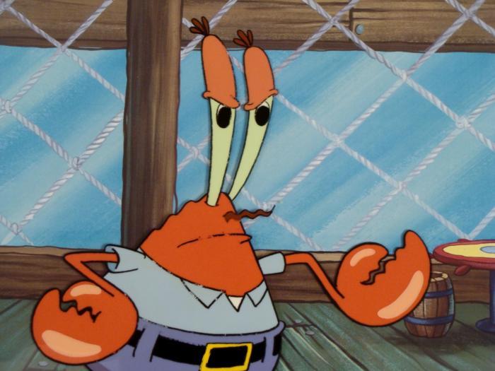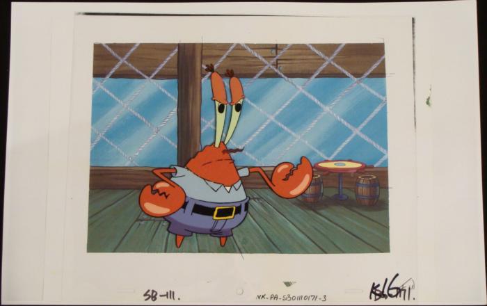 To create production cels, the original animator's drawing is transferred onto an acetate cel (by hand-inking and/or photo copying). The cel is then hand-painted on the reverse side. The background accompanying this set-up is a reproduction background. The printed background is ready to be matted and framed. The notations are located at the bottom of both. There is some paint fade to Mr. Krab's outline.