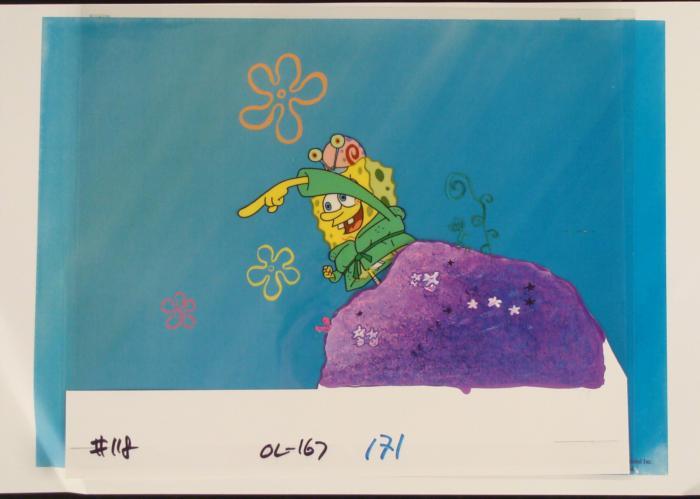 To create production cels, the original animator's drawing is transferred onto an acetate cel (by hand-inking and/or photo copying). The cel is then hand-painted on the reverse side. The background accompanying this set-up is a reproduction background. The background is ready to be matted and framed. It is a colored background with a cel and has the animator's notations at the bottom both. The cel has multi-layers; first is a purple rock and next is Spongebob and Gary. The bottom left corner of the background has been folded.