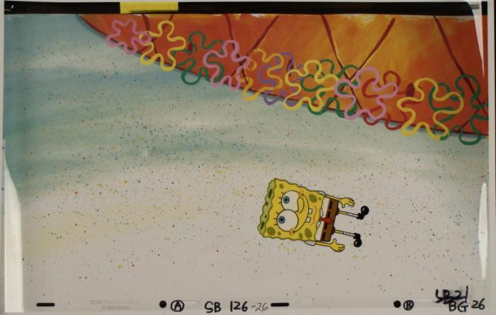 This animation cel and reproduction background are from the Nickelodeon TV show SpongeBob Squarepants. The story takes place under the deep blue sea in Bikini Bottom, where SpongeBob resides. SpongeBob, who is a yellow, porous sponge, is your typical happy-go-lucky character, as he is always cheerful and enjoys making people laugh. Patrick Star, SpongeBob's neighbor who is a starfish, is your average children's show idiot, as he boasts knowing nothing and is often getting himself into ridiculous situations. Between the homes of these two lies the home of the miserable Squidward, a squid, who is known for being grouchy and playing tricks on SpongeBob and Patrick. Both SpongeBob and Squidward work at the Krusty Krab, a fast food business run by the greedy money-loving Mr. Krabs, a crab, the arch rival of the evil, possibly misunderstood, Plankton. Another neighbor, Sandy Cheeks, an athletic squirrel who normally wears an astronaut's space suit, was introduced in "Tea at the Treedome." She spends most of her time inventing and experimenting. Sideways... Good look. Original Printed Background and Animated Cel Overall Size of Background: 11" x 17" Overall Size of the Cel: 10 1/2" x 16 1/2" Very good condition This is an original hand-painted cel set-up used in the production of an episode of "SpongeBob SquarePants." Each one-of-a-kind set-up represents a slight change in position of the characters. When individually photographed and projected in rapid succession, the images appear to move.