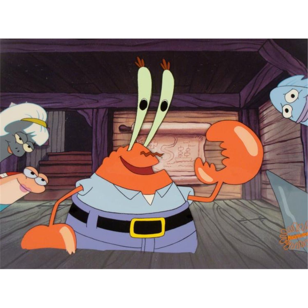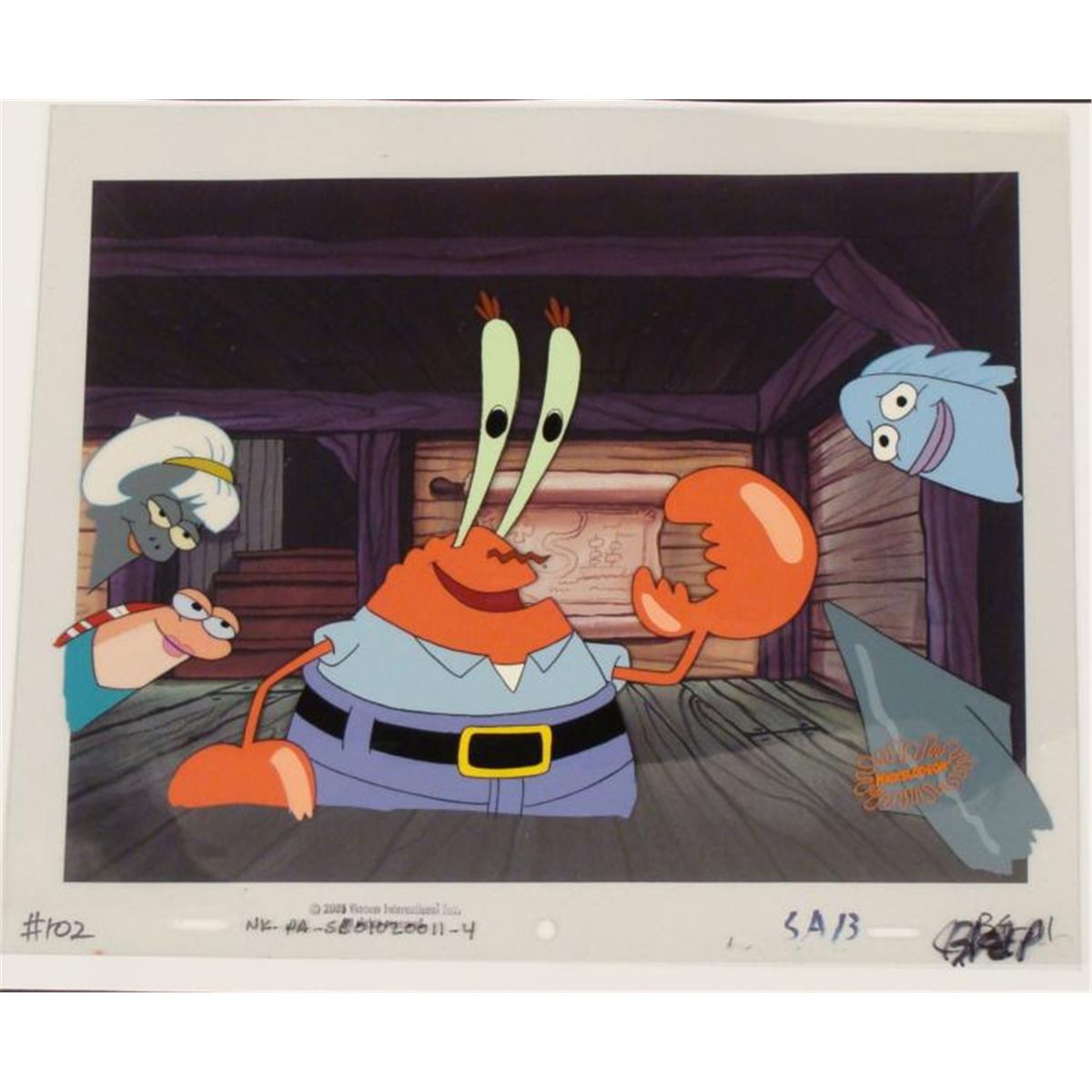 This animation cel and reproduction background are from the Nickelodeon TV show SpongeBob Squarepants. The story takes place under the deep blue sea in Bikini Bottom, where SpongeBob resides. SpongeBob, who is a yellow, porous sponge, is your typical happy-go-lucky character, as he is always cheerful and enjoys making people laugh. Patrick Star, SpongeBob's neighbor who is a starfish, is your average children's show idiot, as he boasts knowing nothing and is often getting himself into ridiculous situations.Between the homes of these two lies the home of the miserable Squidward, a squid, who is known for being grouchy and playing tricks on SpongeBob and Patrick. Both SpongeBob and Squidward work at the Krusty Krab, a fast food business run by the greedy money-loving Mr. Krabs, a crab, the arch rival of the evil, possibly misunderstood, Plankton. Another neighbor, Sandy Cheeks, an athletic squirrel who normally wears an astronaut's space suit, was introduced in "Tea at the Treedome." She spends most of her time inventing and experimenting. * * Krusty appears to be getting mixed signals from his companions; not quite sure if his idea will work... * * Original Printed Background and Animated Cel Overall Size of Background: 11" x 17" Overall Size of the Cel: 10 1/2" x 12 1/2" Excellent Condition * This is an original hand-painted cel set-up used in the production of an episode of "SpongeBob SquarePants", titled Squeaky Boots. Each one-of-a-kind set-up represents a slight change in position of the characters. When individually photographed and projected in rapid succession, the images appear to move. * To create production cels, the original animator's drawing is transferred ont oan acetate cel (by hand-inking and/or photo copying). The cel is then hand-painted on the reverse side. The background accompanying this set-up is a reproduction background. * The printed background and cel are ready to be matted and framed. The notations are located at the bottom of both. The cel is multi-layered: first is Krusty, then a blue fish and pink fish, followed by a gray fish and squid . The Nickelodeon logo is located at the bottom right of the first cel. * *