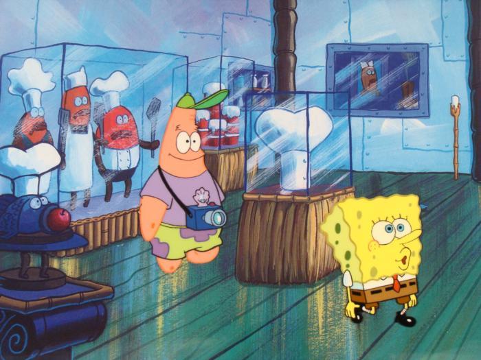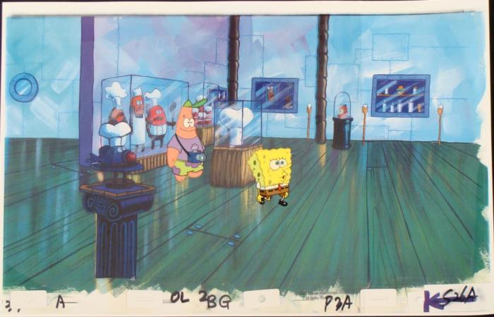 This original animation cel and reproduction background are from the Nickelodeon TV show SpongeBob Squarepants. The story takes place under the deep blue sea in Bikini Bottom, where SpongeBob resides. SpongeBob, who is a yellow, porous sponge, is your typical happy-go-lucky character, as he is always cheerful and enjoys making people laugh. Patrick Star, SpongeBob's neighbor who is a starfish, is your average children's show idiot, as he boasts knowing nothing and is often getting himself into ridiculous situations. Between the homes of these two lies the home of the miserable Squidward, a squid, who is known for being grouchy and playing tricks on SpongeBob and Patrick. Both SpongeBob and Squidward work at the Krusty Krab, a fast food business run by the greedy money-loving Mr. Krabs, a crab, the arch rival of the evil, possibly misunderstood, Plankton. Another neighbor, Sandy Cheeks, an athletic squirrel who normally wears an astronaut's space suit, was introduced in "Tea at the Treedome." She spends most of her time inventing and experimenting. Spongbob and Patrick appear to be strolling around a museum together. Original Production Animated Cel and Reproduction BackgroundOverall Size of Background: 11" x 17" Overall Size of the Cel: 10 1/2" x 16 1/2" Very good condition; it has been storedThis is an original hand-painted cel set-up used in the production of an episode of "SpongeBob SquarePants." Each one-of-a-kind set-up represents a slight change in position of the characters. When individually photographed and projected in rapid succession, the images appear to move.