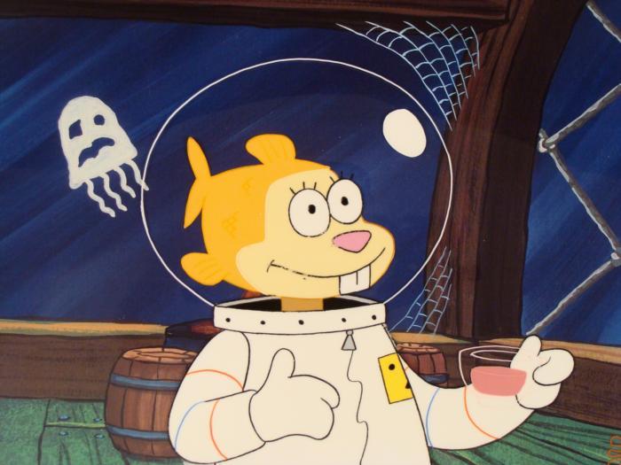 This original animation cel and reproduction background are from the Nickelodeon TV show SpongeBob Squarepants. The story takes place under the deep blue sea in Bikini Bottom, where SpongeBob resides. SpongeBob, who is a yellow, porous sponge, is your typical happy-go-lucky character, as he is always cheerful and enjoys making people laugh. Patrick Star, SpongeBob's neighbor who is a starfish, is your average children's show idiot, as he boasts knowing nothing and is often getting himself into ridiculous situations. Between the homes of these two lies the home of the miserable Squidward, a squid, who is known for being grouchy and playing tricks on SpongeBob and Patrick. Both SpongeBob and Squidward work at the Krusty Krab, a fast food business run by the greedy money-loving Mr. Krabs, a crab, the arch rival of the evil, possibly misunderstood, Plankton. Another neighbor, Sandy Cheeks, an athletic squirrel who normally wears an astronaut's space suit, was introduced in "Tea at the Treedome." She spends most of her time inventing and experimenting. Sandy is enjoying her cold refreshment and fish costume at what looks like Mr. Krabs Halloween party. Original Animated Cel and Reproduction Background Overall Size of Background: 11" x 17" Overall Size of the Cel: 10 1/2" x 12 1/2" Excellent conditionThis is an original hand-painted cel set-up used in the production of an episode of "SpongeBob SquarePants." Each one-of-a-kind set-up represents a slight change in position of the characters. When individually photographed and projected in rapid succession, the images appear to move.