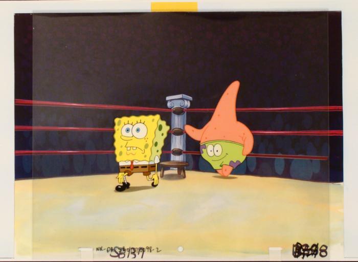 This original animation cel and reproduction background are from the Nickelodeon TV show SpongeBob Squarepants. The story takes place under the deep blue sea in Bikini Bottom, where SpongeBob resides. SpongeBob, who is a yellow, porous sponge, is your typical happy-go-lucky character, as he is always cheerful and enjoys making people laugh. Patrick Star, SpongeBob's neighbor who is a starfish, is your average children's show idiot, as he boasts knowing nothing and is often getting himself into ridiculous situations. Between the homes of these two lies the home of the miserable Squidward, a squid, who is known for being grouchy and playing tricks on SpongeBob and Patrick. Both SpongeBob and Squidward work at the Krusty Krab, a fast food business run by the greedy money-loving Mr. Krabs, a crab, the arch rival of the evil, possibly misunderstood, Plankton. Another neighbor, Sandy Cheeks, an athletic squirrel who normally wears an astronaut's space suit, was introduced in "Tea at the Treedome." She spends most of her time inventing and experimenting. What is this???Original Production Background and Animated Cel Overall Size of Background: 11" x 17" Overall Size of the Cels: 10 1/2" x 12 1/2" Very good condition; it has been stored rolled This is an original hand-painted cel set-up used in the production of an episode of "SpongeBob SquarePants." Each one-of-a-kind set-up represents a slight change in position of the characters. When individually photographed and projected in rapid succession, the images appear to move.