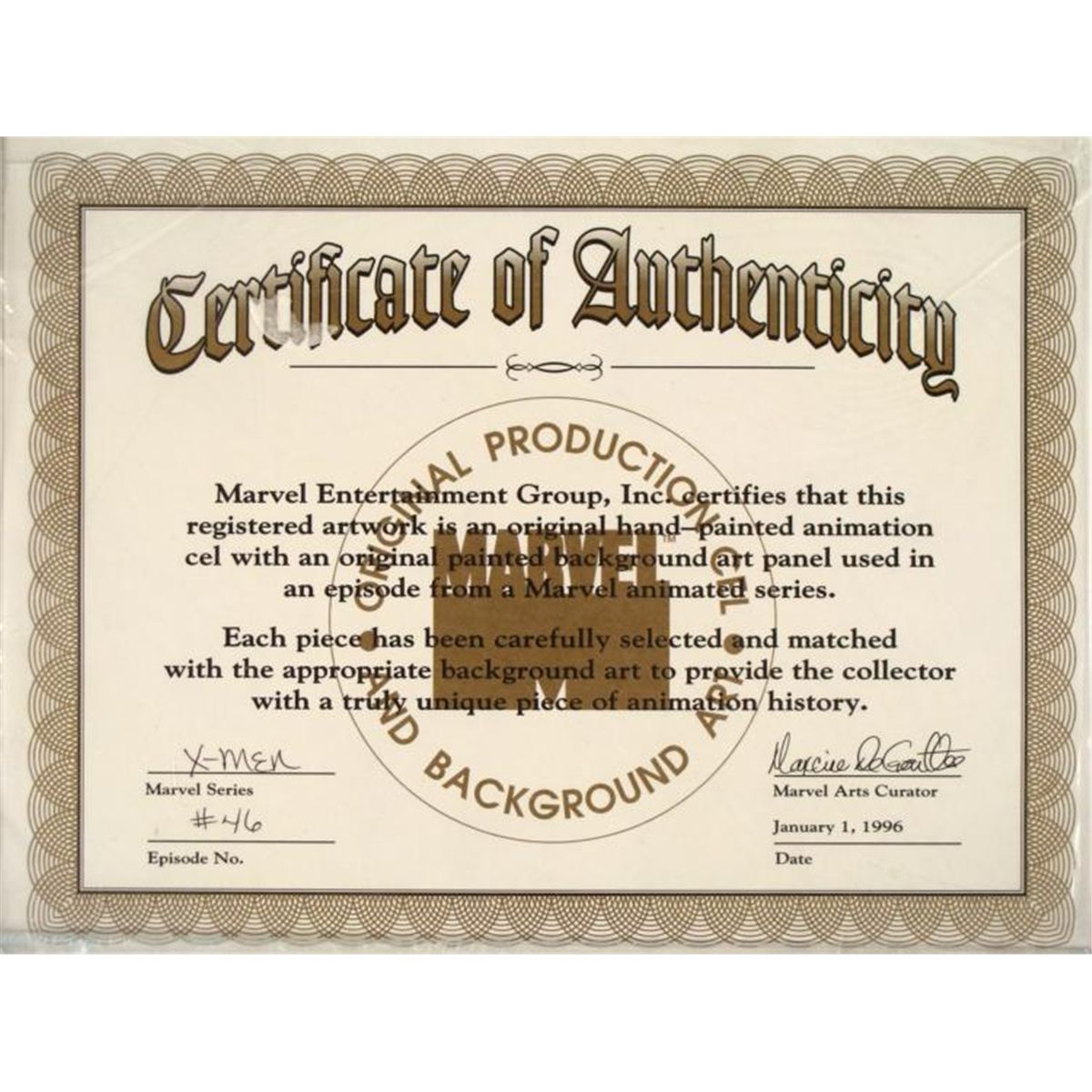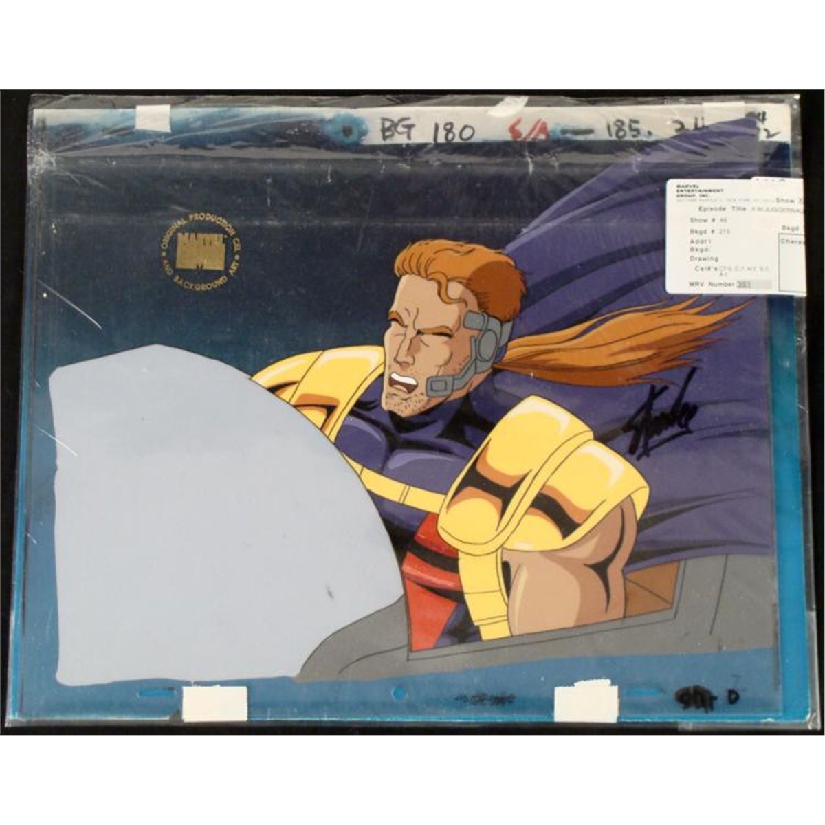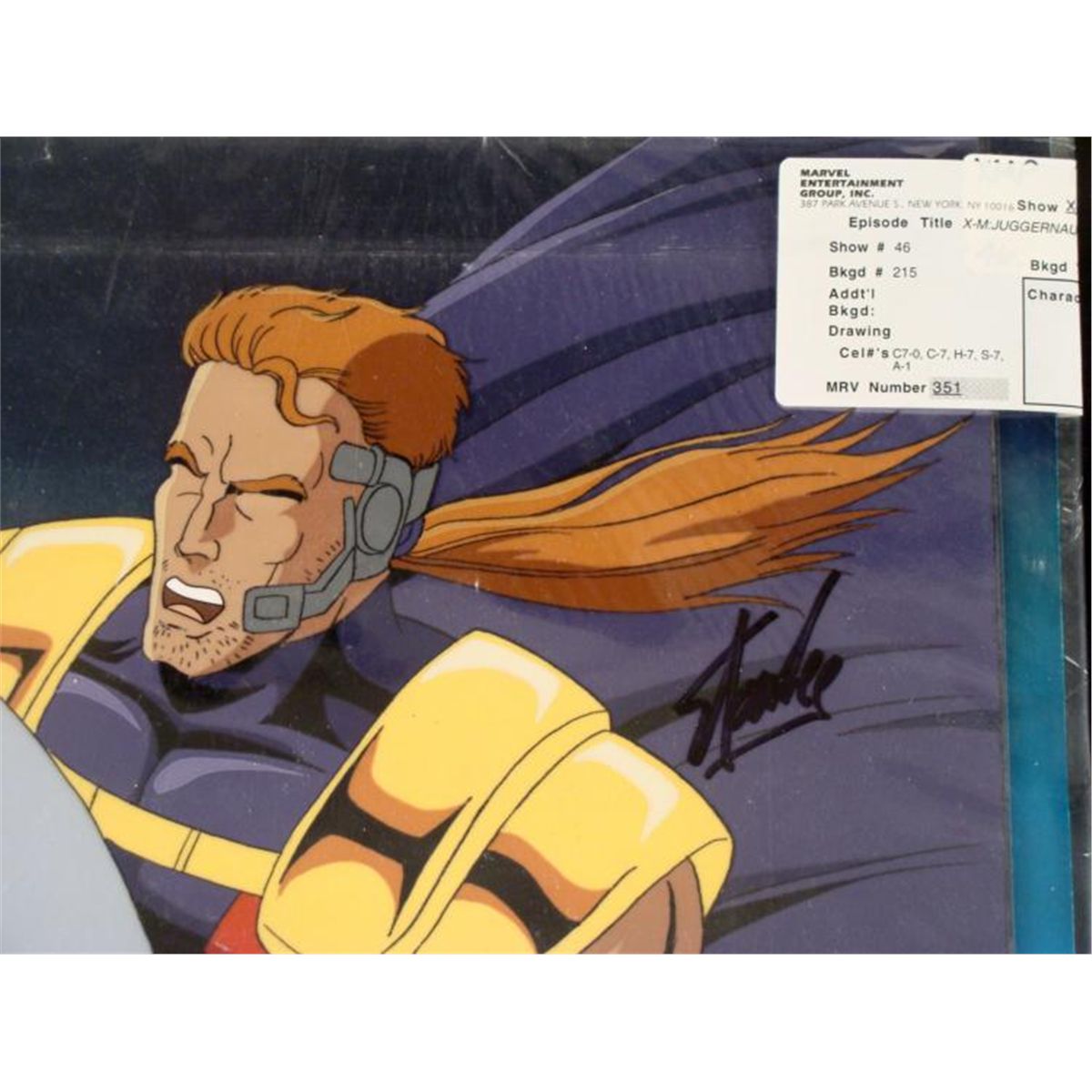 This is an original signed production cel and background are from the hit series X-Men. Stan Lee signature is located at the right of cel in black sharpie. * Under a cloud of increasing anti-mutant sentiment, Professor Xavier creates a haven at his Westchester mansion to train young mutants to use their powers for the benefit of humanity, and to prove mutants can be heroes. Xavier recruited Cyclops, Iceman, Angel, Beast and Jean Grey calling them "X-Men" because they possessed the "x-gene", an ability normal humans lacked. Early issues introduced the team's arch enemy, Magneto and his Brotherhood of Evil Mutants, who would later battle the X-Men for years. * This is greatest day of life, for reasons I can't explain... * Original Animated Cel Overall Size of the Cel: 10 1/2" x 12 1/2" Overall Size of the background: 10 1/2" x 13" Excellent Condition This is an original hand-painted cel set-up used in the production of an episode of X-Men titled "Juggernaut." Each one-of-a-kind set-up represents a slight change in position of the characters. When individually photographed and projected in rapid succession, the images appear to move. * To create production cels, the original animator's drawing is transferred onto an acetate cel (by hand-inking and/or photo copying). The cel is then hand-painted on the reverse side. The background accompanying this set-up is an original production background. * The cel and original background is ready to be matted and framed. The animators notations are located at the bottom of cel and top of the background. A ceritificate of Authenticity from Marvel is on the back of background. The Marvel Seal is located at the top left of the cel. The cel and background are in a protective sleeve An information card about the episode is located at the top right of the protective sleeve. *