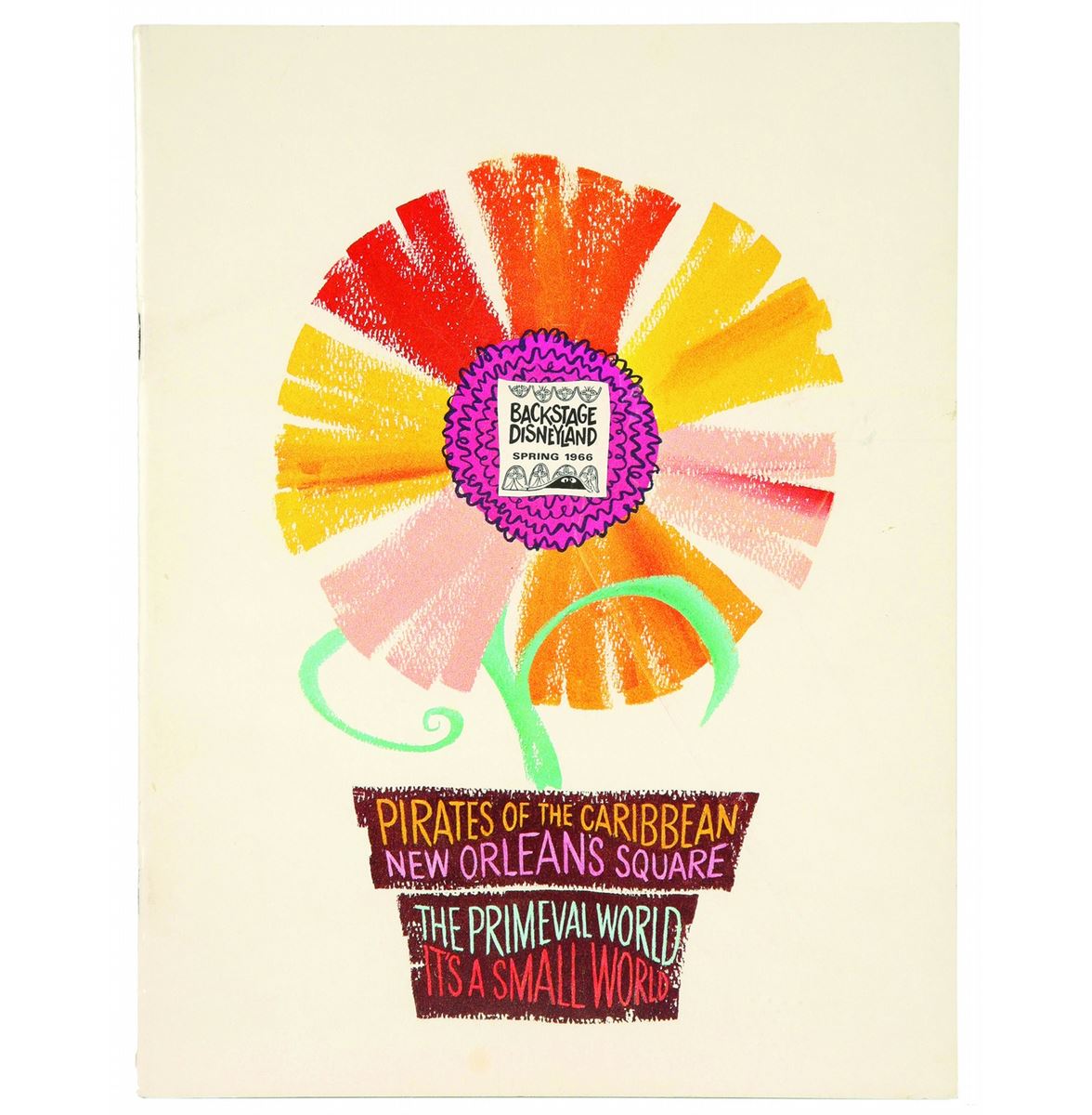 (Disneyland, 1966) Spring 1966 issue of the employee magazine, Backstage Disneyland. The cover hints at the many new attractions in the works at the park, and within the (30) page magazine are fascinating articles on the construction of Primeval World, and some of the many actors working in the park. In very good condition with light wear throughout.