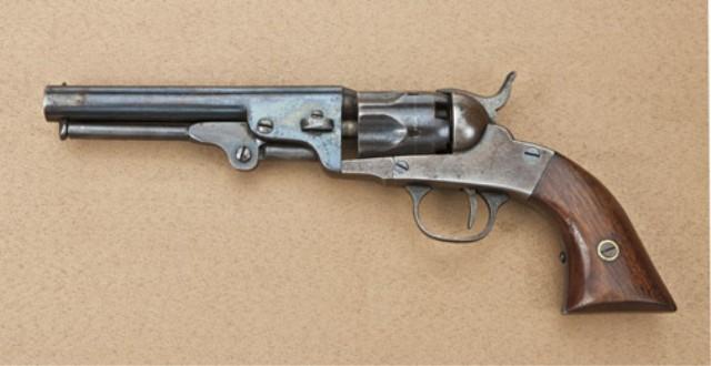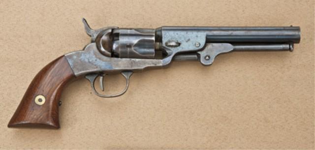 Bacon .31 caliber percussion revolver, 5” barrel, blued finish, wood grips, fluted cylinder, plain frame, serial #25. Shows Bacon Mfg Company, Norwich Connecticut address. Refer Flayderman 7A-008. The pistol remains in very good original condition showing approx. 75-85% original blue on barrel and cylinder, evenly drifting at the edges and going to brownish patina. Some scattered light erosion and pinprick pitting. The cylinder shows a slight index line, the frame shows 10-20% bl the balance flaked and going to a brown patina. The loading lever and hammer shows considerable case hardening, at least 30-50% within their patina. The varnish wood grips are very good with 30-50% varnish, normal edge wear, at least very good. The action is tight, the interior near excellent. A crispy Bacon. Est: $700 - $1,400