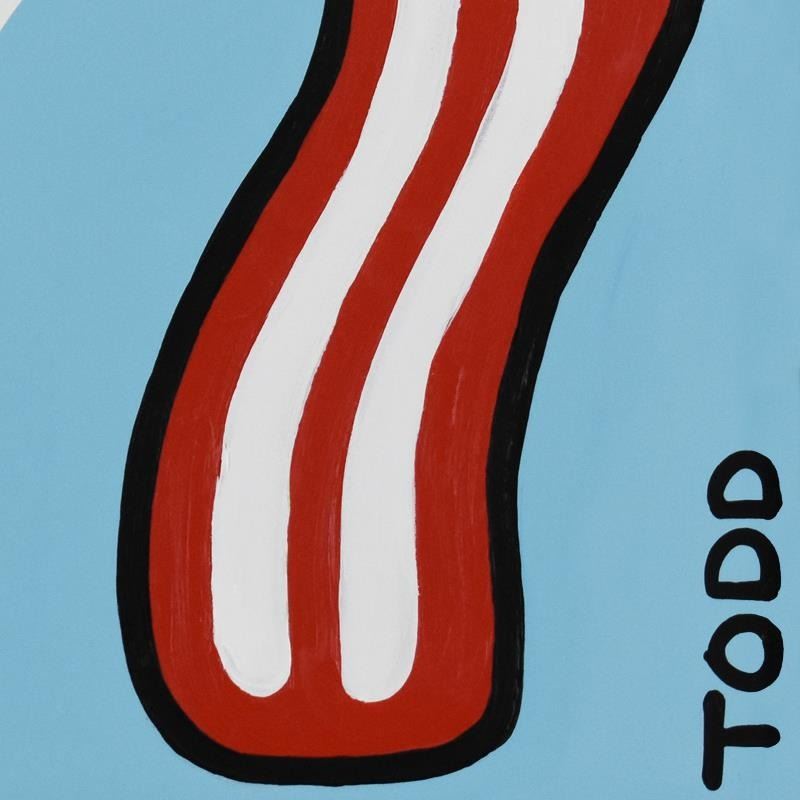 "Bacon" is an original acrylic painting on canvas, hand signed by Todd Goldman. This piece comes framed. Includes Letter of Authenticity. Measures approx. 26" x 20" (frame), 23.5" x 17.5" (image). This piece had a small puncture hole on the bottom-right corner of the canvas that has been repaired and is not visible.