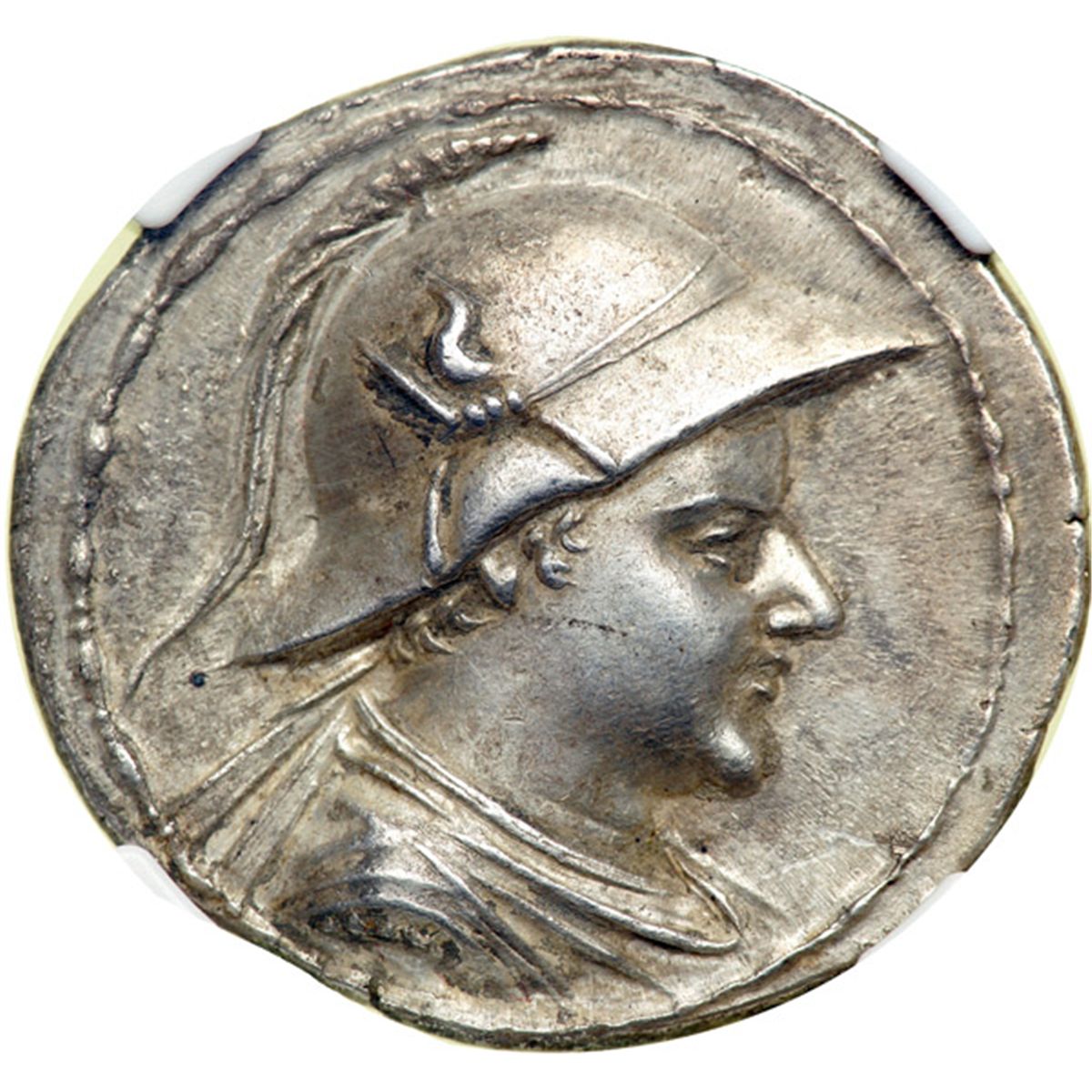 Bactria. Eukratides, c. 171-135 BC. AR Tetradrachm (16.79g). Helmeted, diademed and draped bust right. Reverse: The Dioskouroi, holding palm fronds and spears, on horses rearing right. Bop. pl. 3, 39. NGC graded Choice AU: Strike 5/5; Surface 3/5.