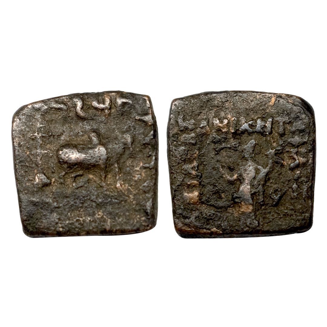 Bactria, Philoxenus (125-110 BC), Copper Unit, 7.87 gms, Obv. goddess standing facing, head left, right hand raised in benediction, cornucopia cradled in left arm, Rev. zebu standing right, fine, very rare.