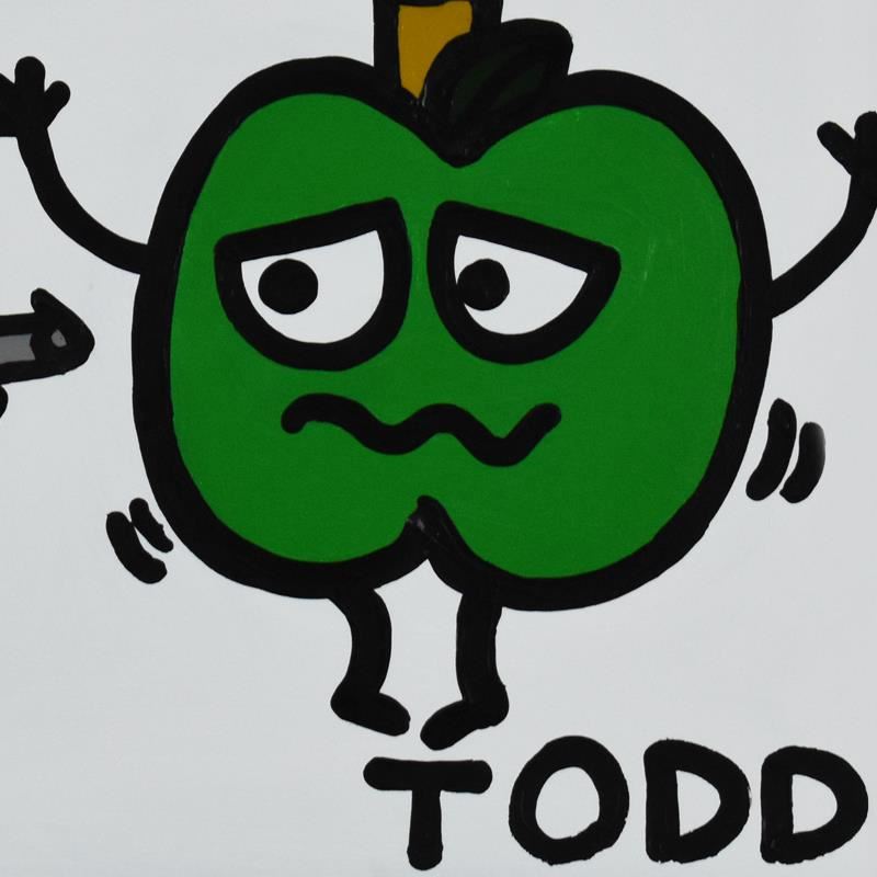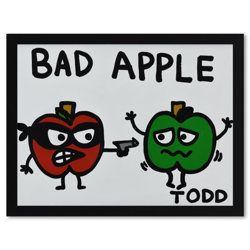 "Bad Apple" is an original acrylic painting on canvas, hand signed by Todd Goldman. This piece comes framed. Includes Letter of Authenticity. Measures approx. 26" x 20" (frame), 23.5" x 17.5" (image). There is minor wear on the frame but this piece is ove