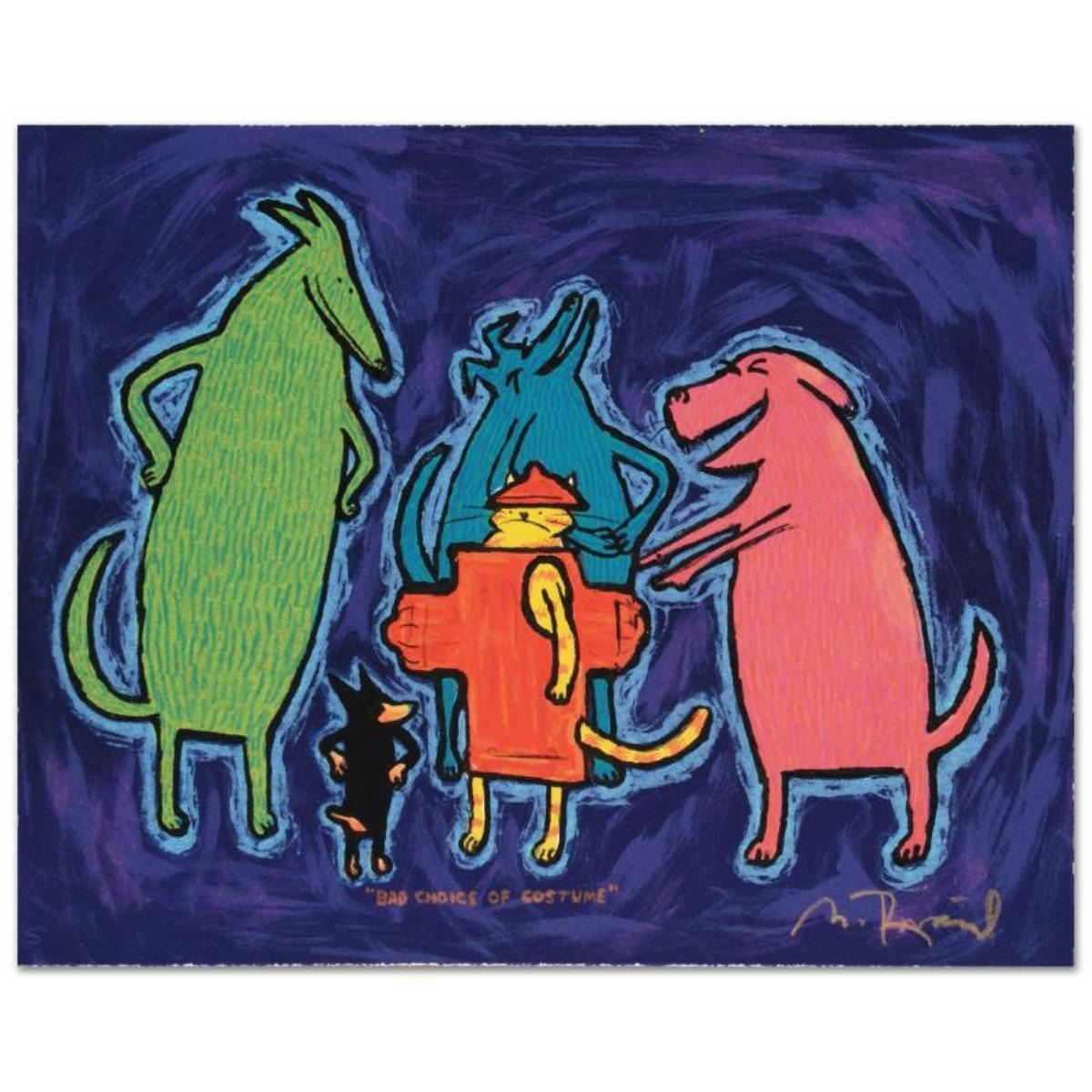 Bad Choice Of Costume by Rinard, Matt. "Bad Choice Of Costume" is a limited edition hand pulled original lithograph on museum quality deckle-edge paper, numbered and hand signed by Matt Rinard. Includes Certificate of Authenticity! Measures approx. 12.5" x 10" (image). This lithograph was created on a rare antique Marinoni Voirin French press that dates back to the 1800's. It provides highly pigmented inks that will resist fading and preserve the integrity of the print for more than a lifetime. This process is the most elaborate, costly and effective way to reproduce art while maintaining the brilliance and accuracy of the original creation.