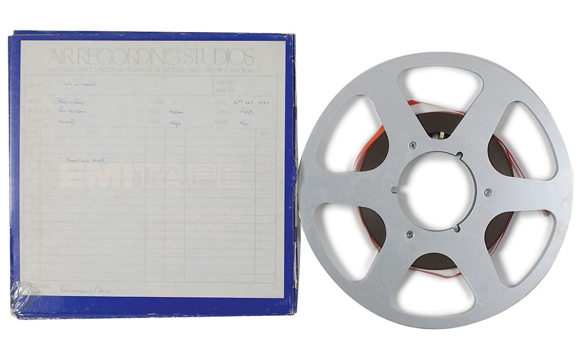 Vintage “copy of master” 10? tape reel of Bad Company’s ‘Shooting Star,’ featured on their 1975 sophomore album Straight Shooter. Affixed to the box is a large Air Recording Studios label, dated October 31, 1974, and hand-notated with relevant information and technical data, including “Speed: 15 IPS, Mode: Stereo, Curve: NAB.” In overall fine condition. Originates from the personal collection of legendary engineer and producer Ron Nevison.