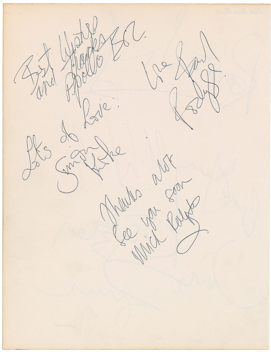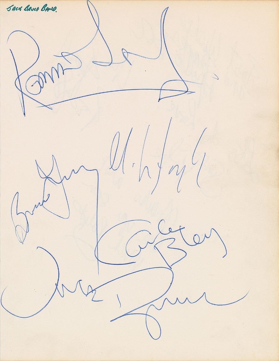 Circa 1974 ballpoint signatures and inscription, “Best Wishes, and Thanks Apollo, Boz [Burrell],” “Lots of Love, Simon Kirke,” “Love, Paul Rodgers,” and “Thanks a lot, see you soon, Mick Ralphs,” on an off-white 7.25 x 9.5 album page. Reverse bears ballpoint signatures of the Jack Bruce Band, including: Bruce, Mick Taylor, Carla Bley, Ronnie Leahy, and Bruce Gary. In fine condition.