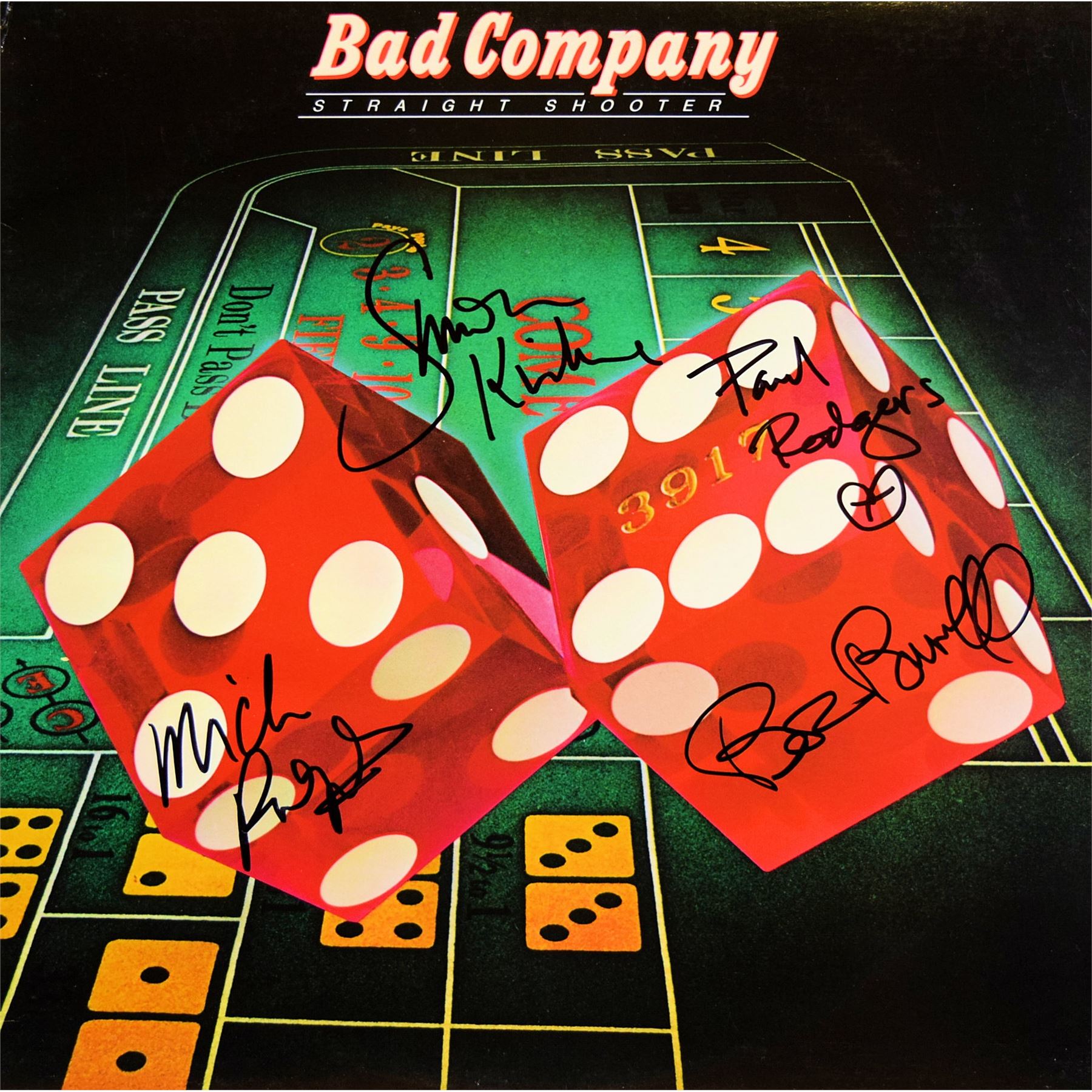 Bad Company signed Straight Shooter 1975 album. Signed: Paul Rodgers, Mick Ralphs, Boz Burrell, and Simon Kirke