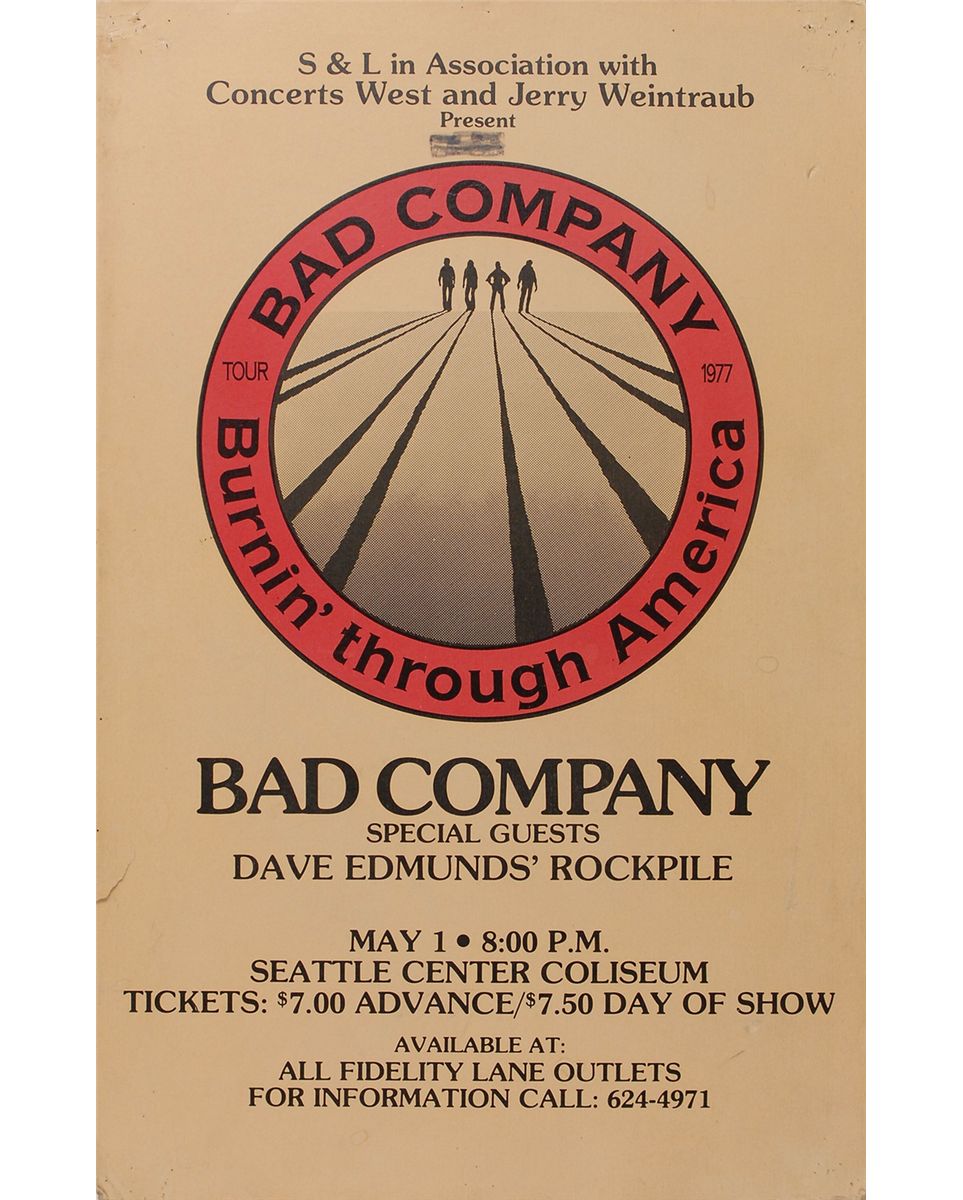 Original color 14 x 21.75 poster for the band’s May 1, 1977, show at the Seattle Center Coliseum on their Burnin’ Through America tour, with special guests Dave Edmunds’s Rockpile. In very good to fine condition, with tack holes to corners, a bit of scattered light soiling and dampstaining, and a small tear to left side.