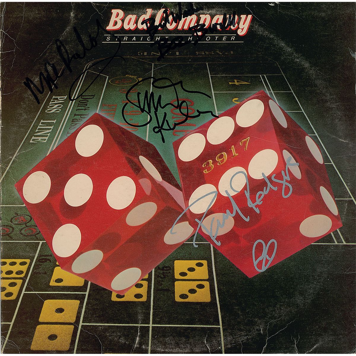Straight Shooter album signed on the front cover in silver ink by Paul Rodgers and in black felt tip by Boz Burrell, Mick Ralphs, and Simon Kirke. Scattered edge creases and a mild ‘ring of wear’ to covers, otherwise fine condition. The record is not included.