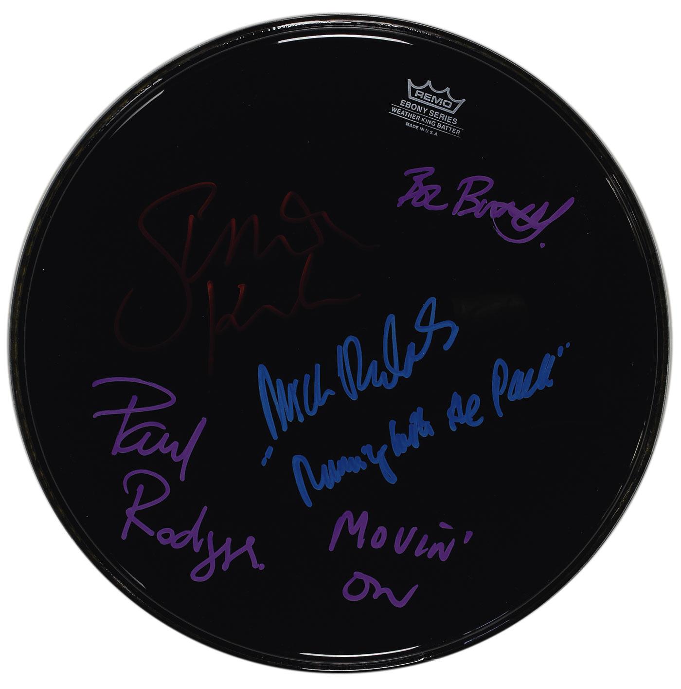 Unused ebony 12” Remo drumhead, signed in various color ink by Paul Rodgers, adding “Movin’ On,” Mick Ralphs, adding “Running with the Band,” Simon Kirke, and Boz Burell. In fine condition. Consignor notes signatures were acquired on their reunion tour in Cleveland, Ohio.