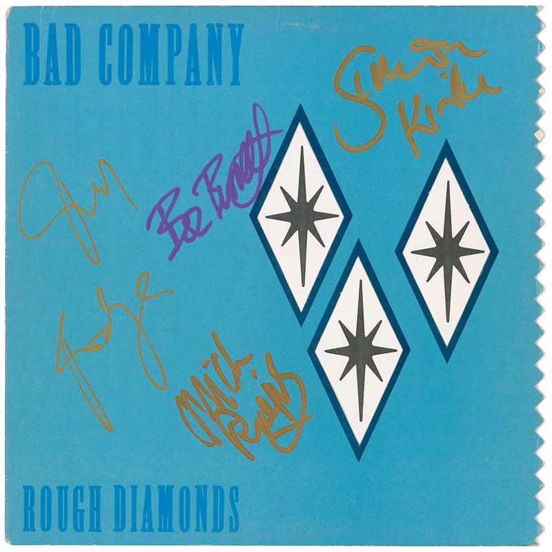 Rough Diamonds album signed on the front cover in gold ink by Paul Rodgers, Simon Kirke, and Mick Ralphs, and in blue felt tip by Boz Burell. In fine condition, with some small creases to right edge. The record is not included.