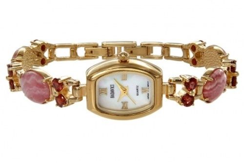 Women's Badavici Pink Rhodocrosite & Mozambique Garnet Gemstone Bracelet Watch - 18k Gold Plating - Stainless Steel Case-Back - Mother Of Pearl Dial With Golkd Tone Roman Numerals At The 3, 6, 9 And 12 Positions And Gold Tone Hour, Minute And Second Hands - Stainless Steel Case Back - Four 10 X 14mm Oval Cabochon Rhodochrosite ( 1.1 Gram Per Piece Total 4.4 Grams ) - Twelve 4 Mm Brilliant Round Cut Mozambique Garnet ( 0.311 Cts Per Piece = Total 3.732 Cts) - 7.5" Overall Length With One .5" Extender
