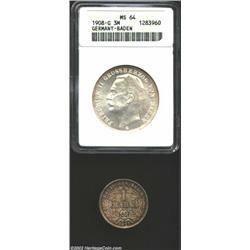 Baden. Friedrich II 3 Mark 1908G, KM280, MS64 ANACS and Empire Mark 1911E KM14, Toned Choice UNC. 2.