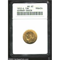 Baden. Friedrich II Gold 10 Marks 1912-G, Head left/Crowned eagle with date and value, F-3761, KM-282, MS62 ANACS. A very elusive year of this short-lived type. Important notice: We expect to be auctioning lots at the rate of 200-250 per hour. Sometimes eBay Premier live bid software cannot keep up with that pace, so we strongly recommend that you place a realistic proxy bid now as insurance to avoid disappointment. Also please note that all Heritage/CAA lots purchased through eBay Premier carry a 20% Buyer's Premium. Please make sure you read the Terms and Conditions.