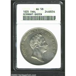 Baden. Leopold Thaler 1835, KM195.2, AU58 ANACS, reverse rim imperfection to the left of 6 o'clock. Important notice: We expect to be auctioning lots at the rate of 200-250 per hour. Sometimes eBay Premier live bid software cannot keep up with that pace, so we strongly recommend that you place a realistic proxy bid now as insurance to avoid disappointment. Also please note that all Heritage/CAA lots purchased through eBay Premier carry a 20% Buyer's Premium. Please make sure you read the Terms and Conditions.