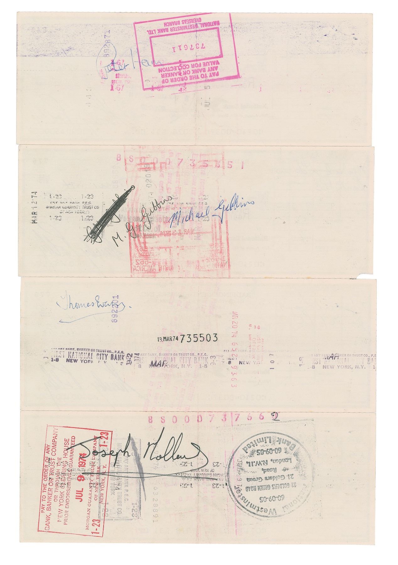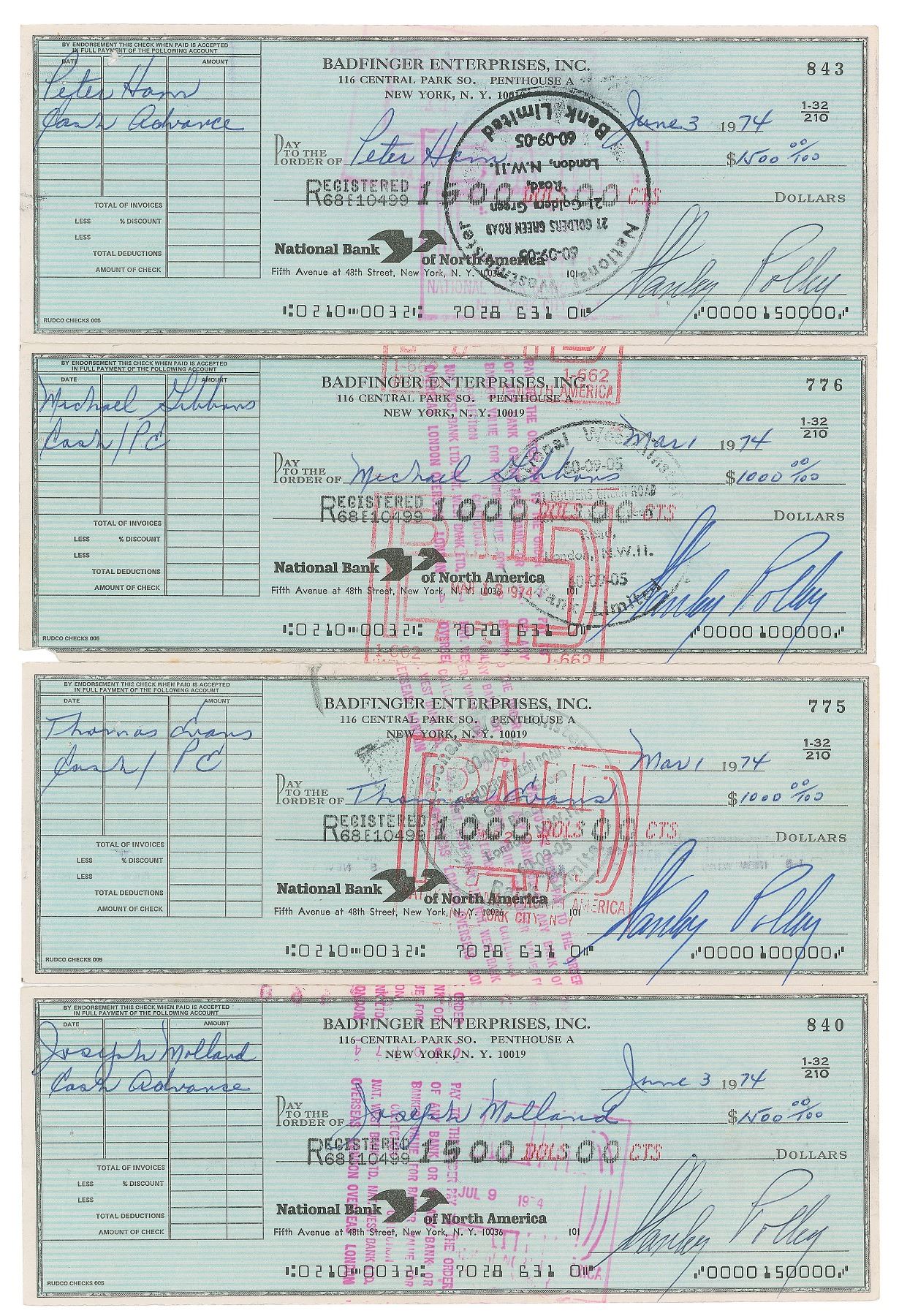 Group of four scarce Badfinger Enterprises business checks, 8.25 x 3, made payable to members of the group for $1000 and $1500, each signed on the front by manager Stan Polley, dated March–June 1974. All are endorsed on the reverse by the recipient, with signers including: Pete Ham, Mike Gibbins, Tom Evans, and Joey Molland. In overall fine condition, with cancellation stamps slightly affecting the signatures. A great grouping from the classic Badfinger lineup.
