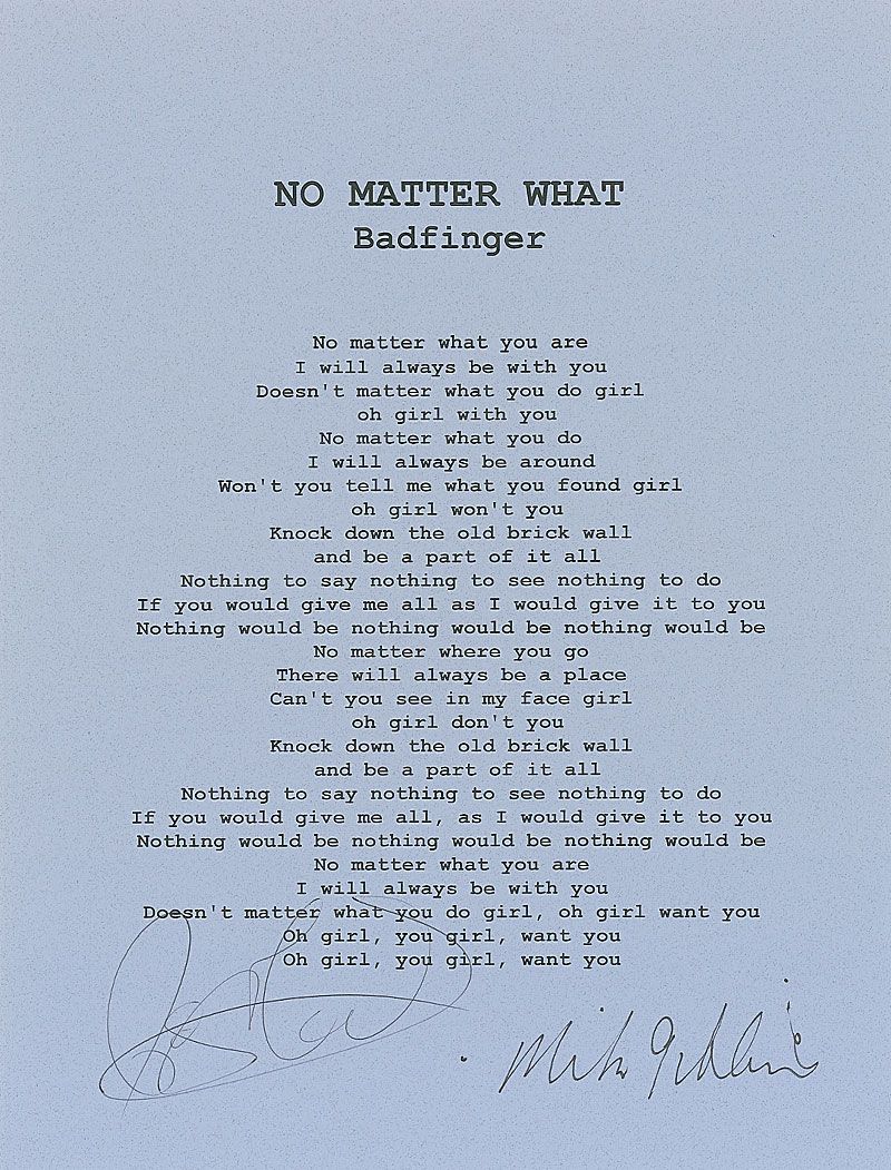 Souvenir printed lyrics to ‘No Matter What,’ one page, 8.5 x 11, signed at the bottom in black ink by Joey Molland and the late Mike Gibbins. In fine condition.