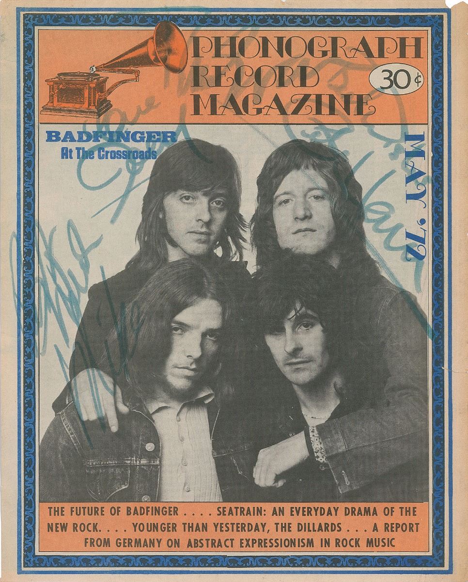 Front cover for a copy of Phonograph Record magazine from May 1972, 8.75 x 10.75, showing the band with the headline, “Badfinger, At the Crossroads,” signed in felt tip by Pete Ham, Joey Molland, Tom Evans, and Mike Gibbins. In fine condition.