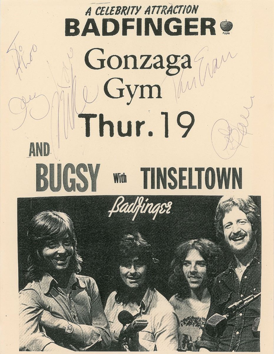Concert flyer for a Badfinger performance at the Gonzaga gym, 8.5 x 11, listing Bugsy and Tinseltown as supporting acts, signed and inscribed in black ballpoint by Pete Ham, Joey Molland, Tom Evans, and Mike Gibbins. In fine condition.