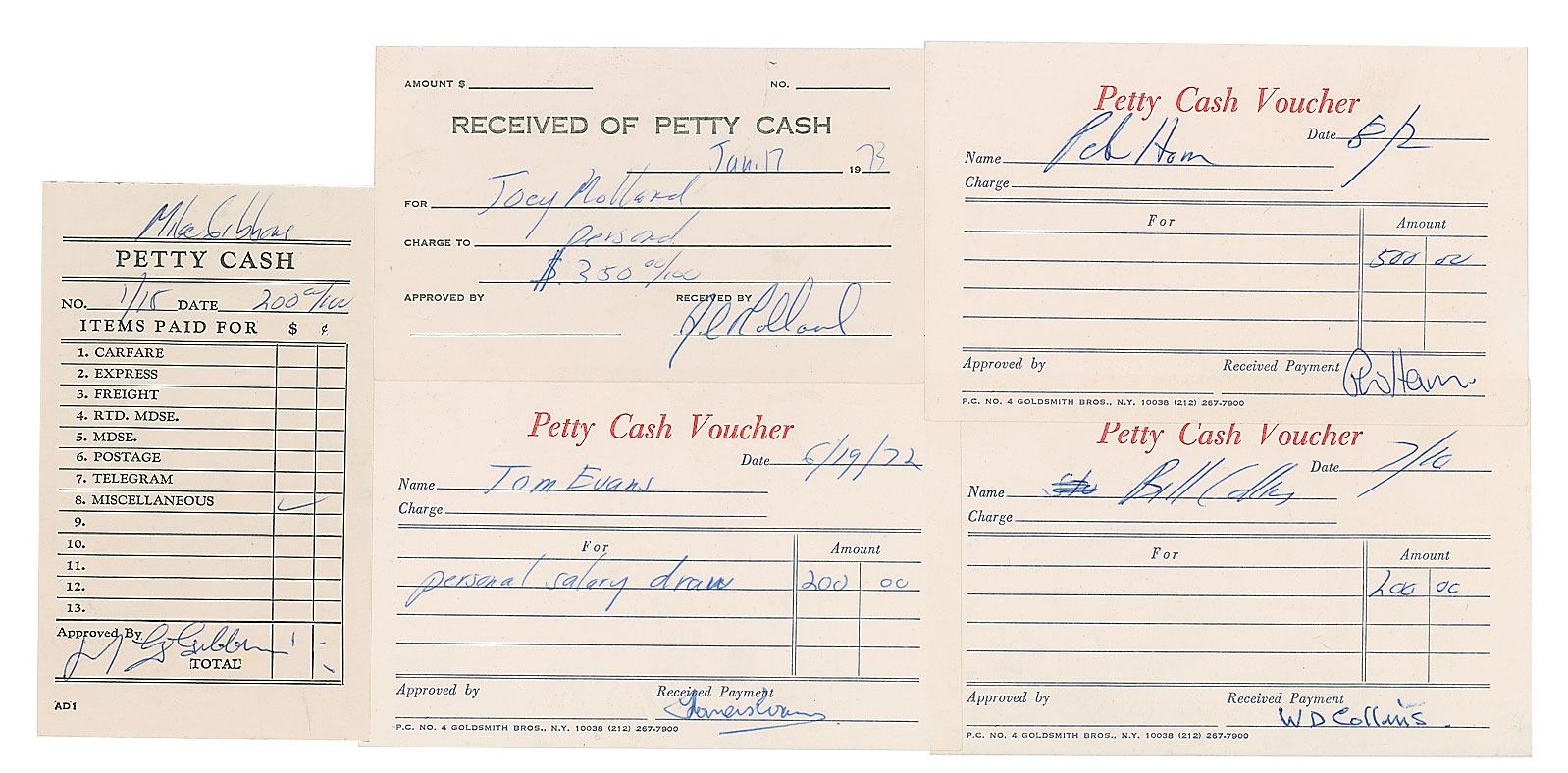 Group of five petty cash voucher receipts, ranging in size from 3 x 5 to 5.5 x 3.5, dated between 1972 and 1973, each filled out in another hand and signed by a member of Badfinger, including: Pete Ham, Tom Evans, Joey Molland, Mike Gibbins, and manager Bill Collins. In overall fine condition.
