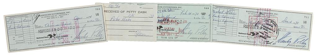 Three endorsed Badfinger Enterprises Inc. business checks, filled out and signed in another hand, endorsed on the reverse by Thomas Evans, Joseph Molland, and Michael Gibbins respectively; and a petty cash receipt for Peter Ham, dated February 6, 1973, signed at the bottom by Ham. In fine condition, with expected stamps and bisecting vertical creases to each check, one lightly affecting Gibbins signature. Pete Ham and Tom Evans both committed suicide, making autographs of the entire band very difficult to find.