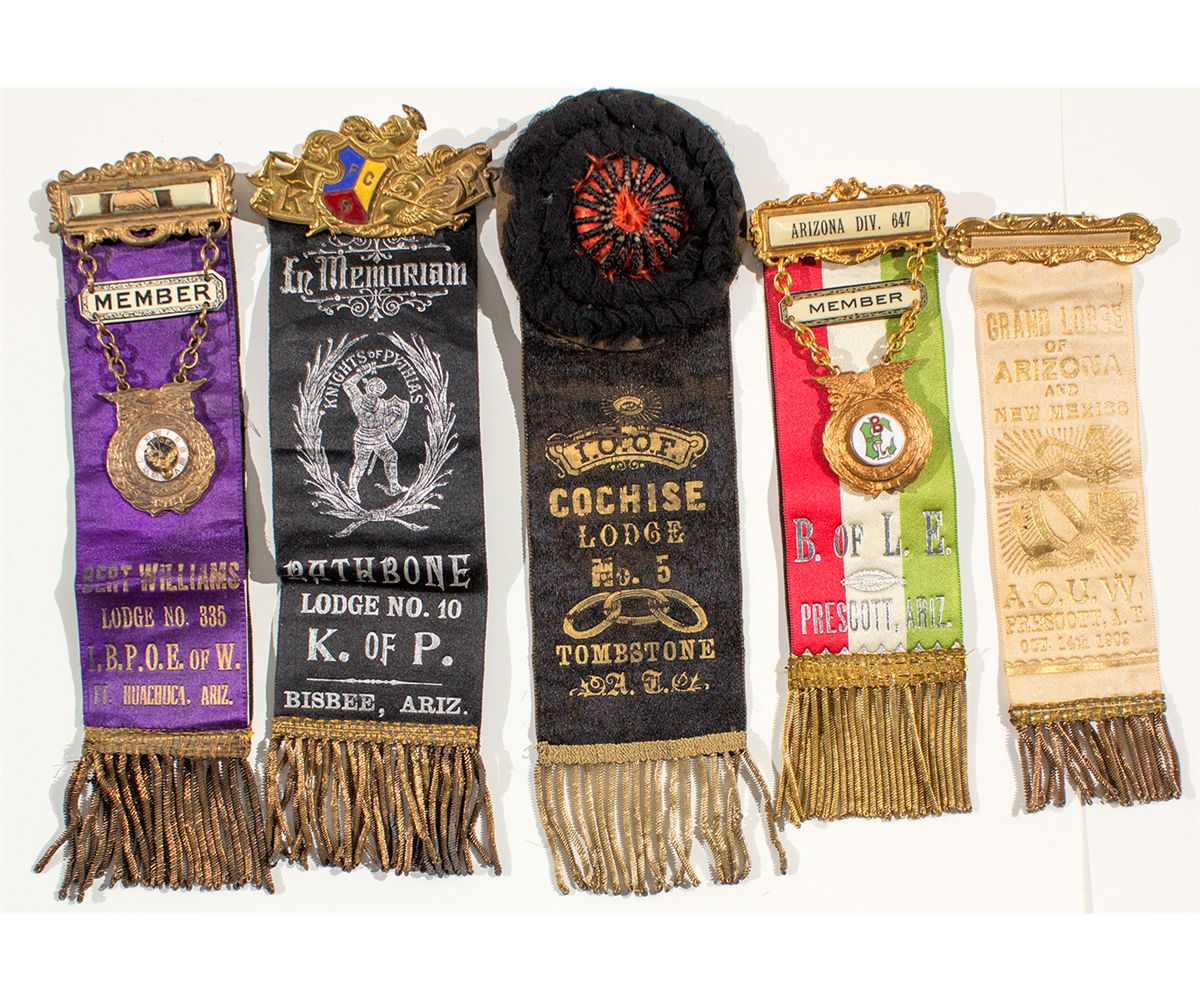 This is a lot 5. 1) Black I.O.O.F ribbon from the Cochise Lodge No. 5. Tombstone. 9.5” x 2.5.” 2) Arizona Div. 647 Member ribbon from the B. of L.E. Prescott. 7.5” x 2.5.” 3) Grand Lodge of Arizona and New Mexico A.O.U.W ribbon. Prescott, A.T. October 14th 1902. 7” x 2.” 4) In memoriam Rathbone Lodge No. 10, Knights of Pythias. Bisbee. 9” x 2.75.” 5) Member ribbon. Bert Williams Lodge No. 335. L.B.P.O.E of W. Fort Huachuca. 9.45” x 2.05.” Bud Bassett Collection - HKA#65375