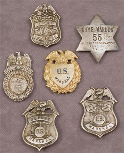 Badge Collection. Six Marshall, Game Warden and Border Patrol badges. (est $600-800). All items appear to be reproductions made by a company, no longer in business, that typically sold high quality reproductions in the range of $60-$100. Collectible in their own right and no longer available other than on the secondary market, these might be a good alternative to the real thing. No statements as to authenticity.