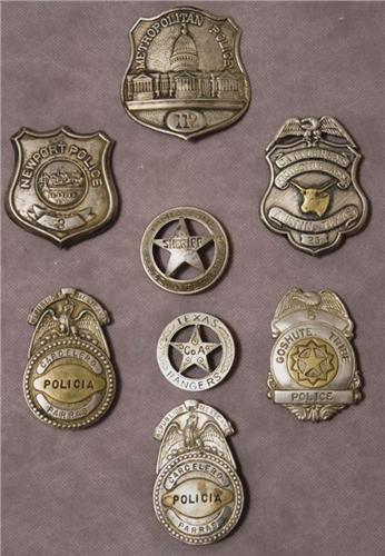 Badge Collection. Eight badges. Police, Indian, Mexican, Austin, Texas and Cattlemen's Protective Assn Badge. (est $600-800). All items appear to be reproductions made by a company, no longer in business, that typically sold high quality reproductions in the range of $60-$100. Collectible in their own right and no longer available other than on the secondary market, these might be a good alternative to the real thing. No statements as to authenticity.